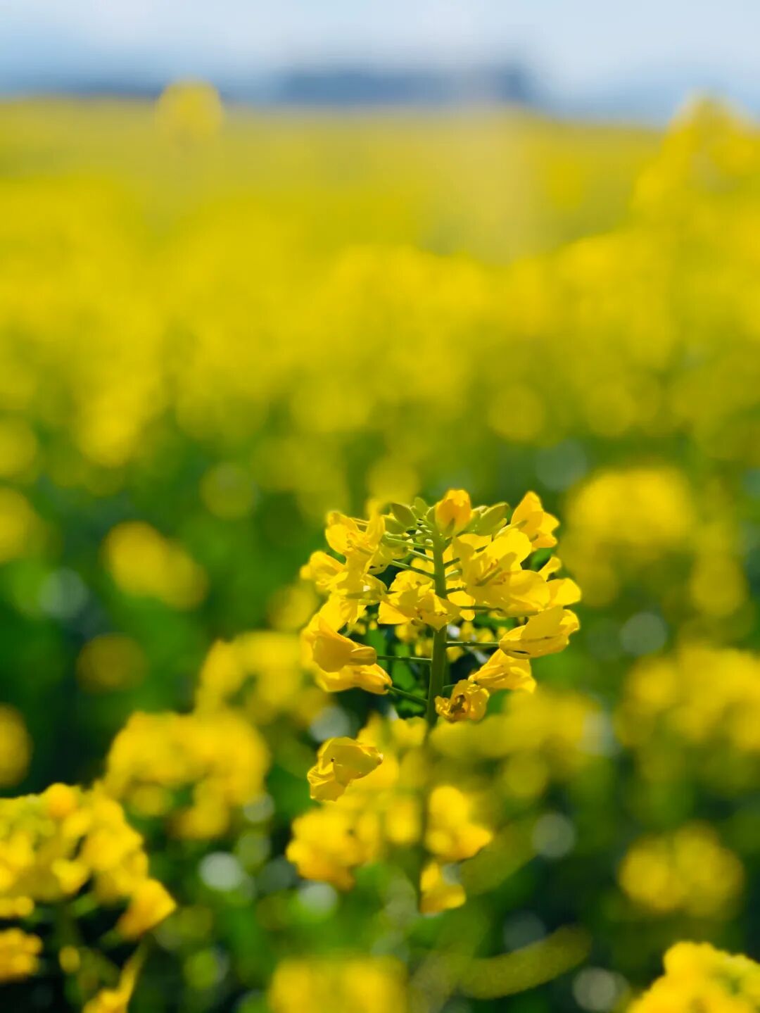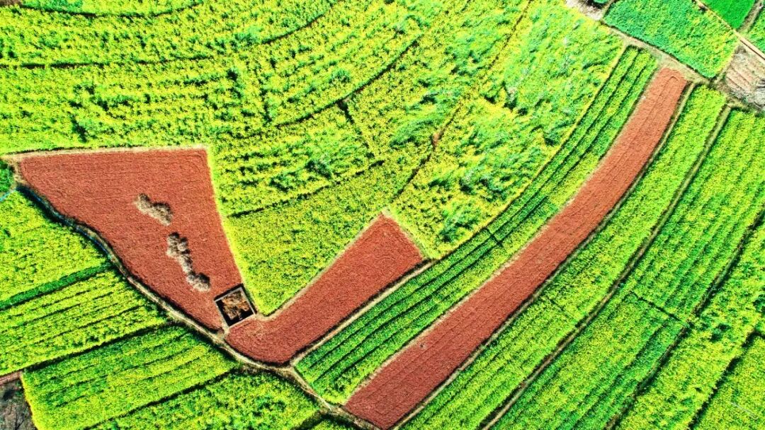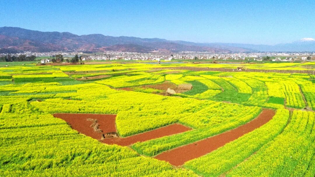 金黃色的油菜花鑲嵌在群山與村莊之間,與碧綠的田野、清澈的池塘以及縱橫交錯的鄉(xiāng)村道路構(gòu)成了一幅五彩繽紛的鄉(xiāng)村田園風(fēng)光畫卷。