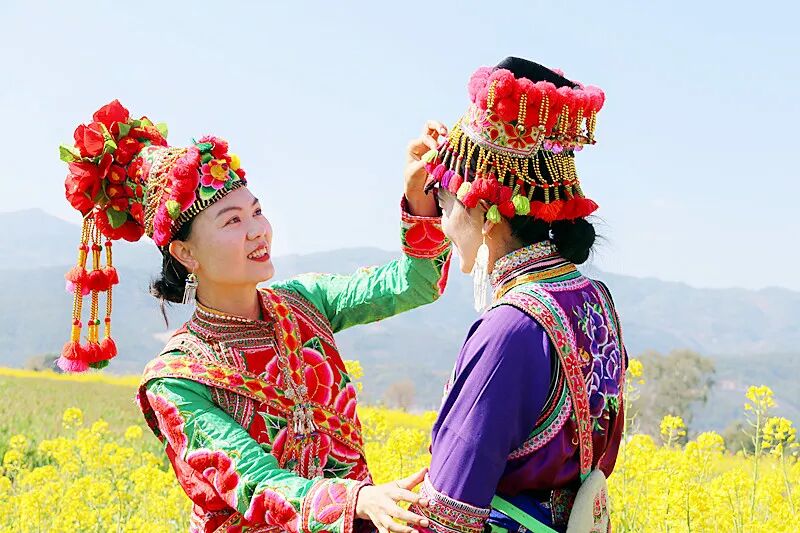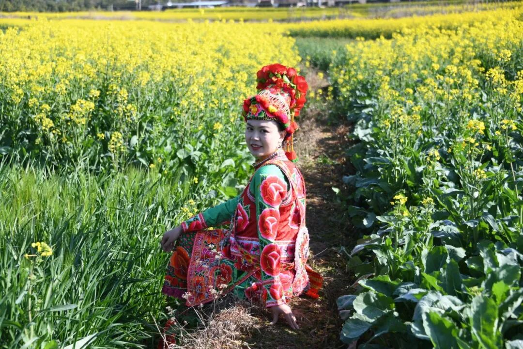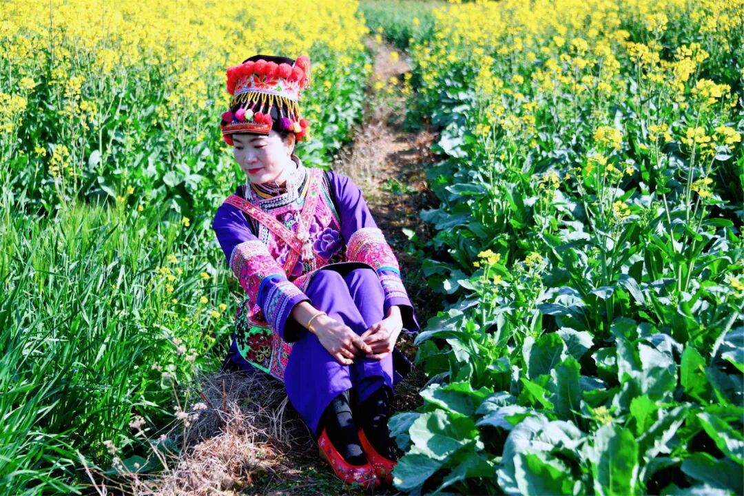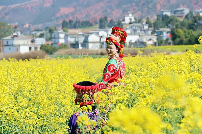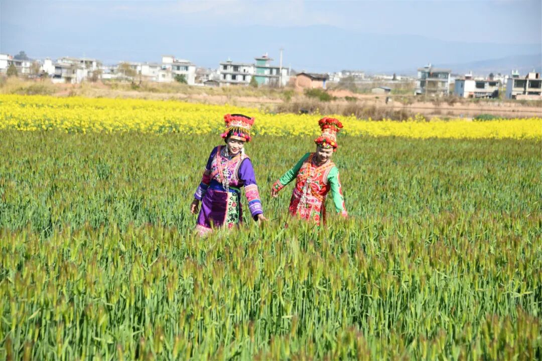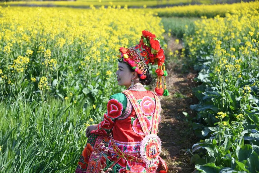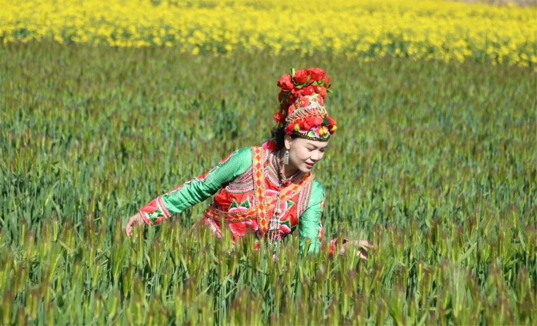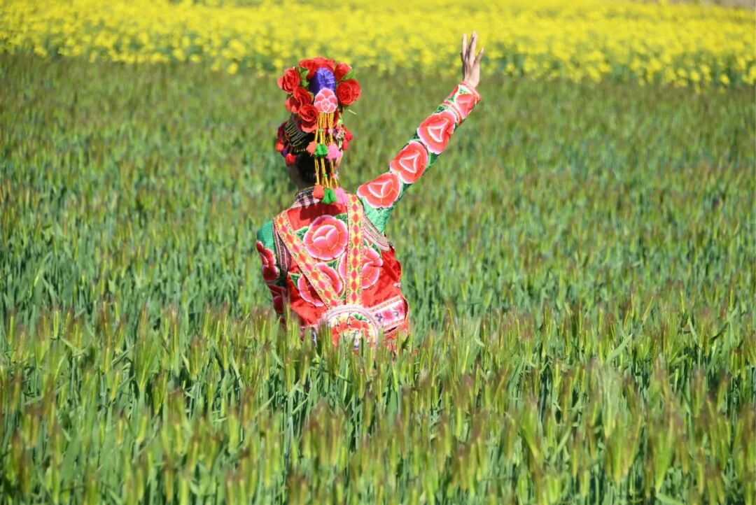 在綠油油的麥田和金燦燦的油菜花的映襯下,身著絢麗的彝族服裝的小姐姐更加美麗動人,可謂美景襯美人。