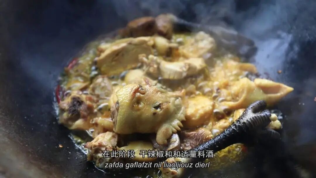 煮雞時先將雞肉進(jìn)行煎炒,在此階段,干辣椒和適量料酒是唯一的配料,在鍋中炒五分鐘左右,待雞肉的水分炒干后加入開水大火烹煮,之后放入草果、胡椒、鹽調(diào)味。要想達(dá)到上佳的口感,一般20多分鐘后就要果斷起鍋。
