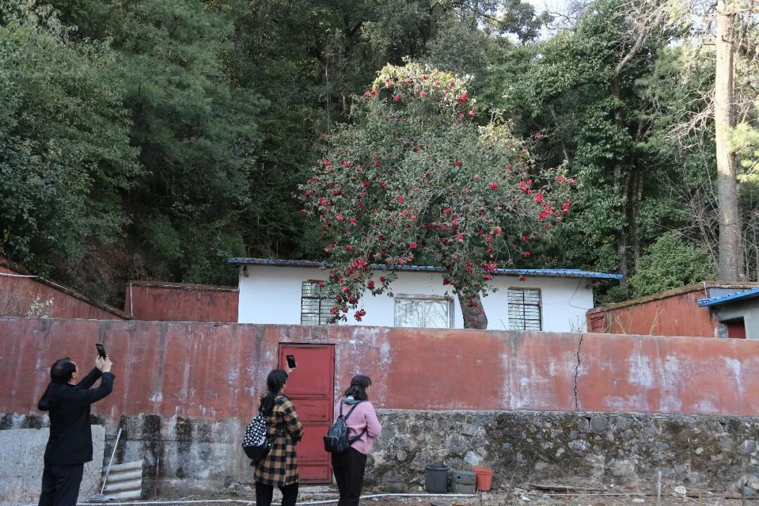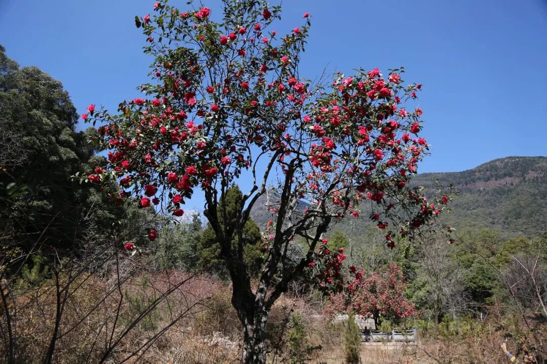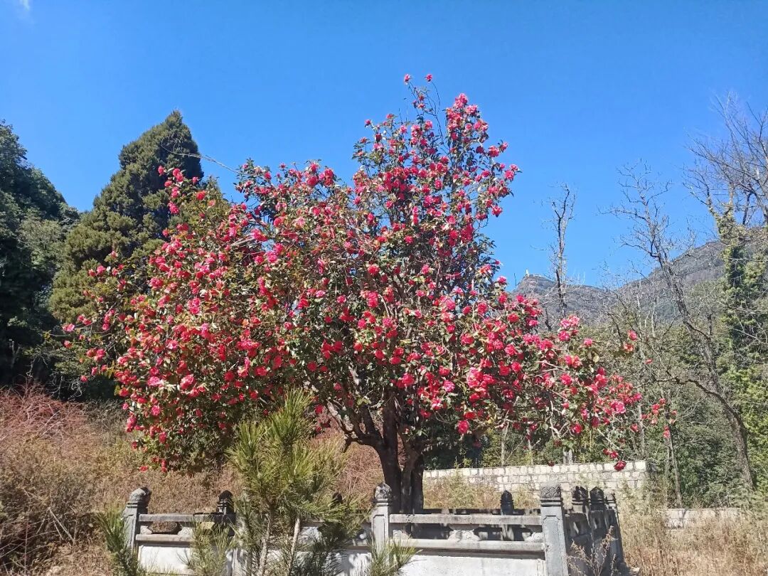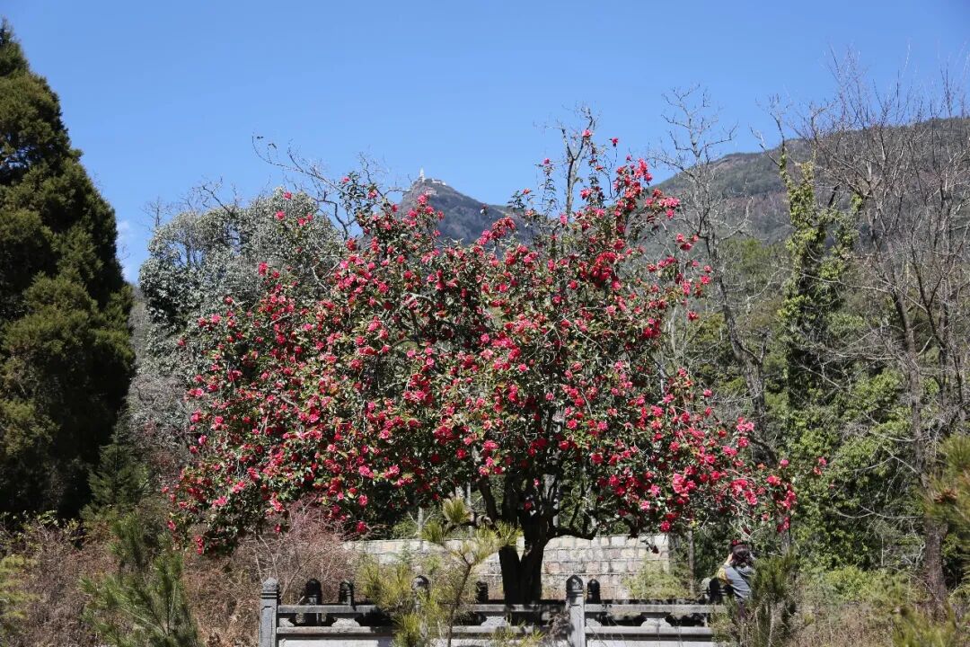 朋友介紹雞足山華嚴(yán)寺、慧燈庵300多年前的3株古山茶歷經(jīng)嚴(yán)冬孕蕾,冰雪洗禮,春風(fēng)吹開(kāi),萬(wàn)朵紅艷,我們迫不及待前行。
