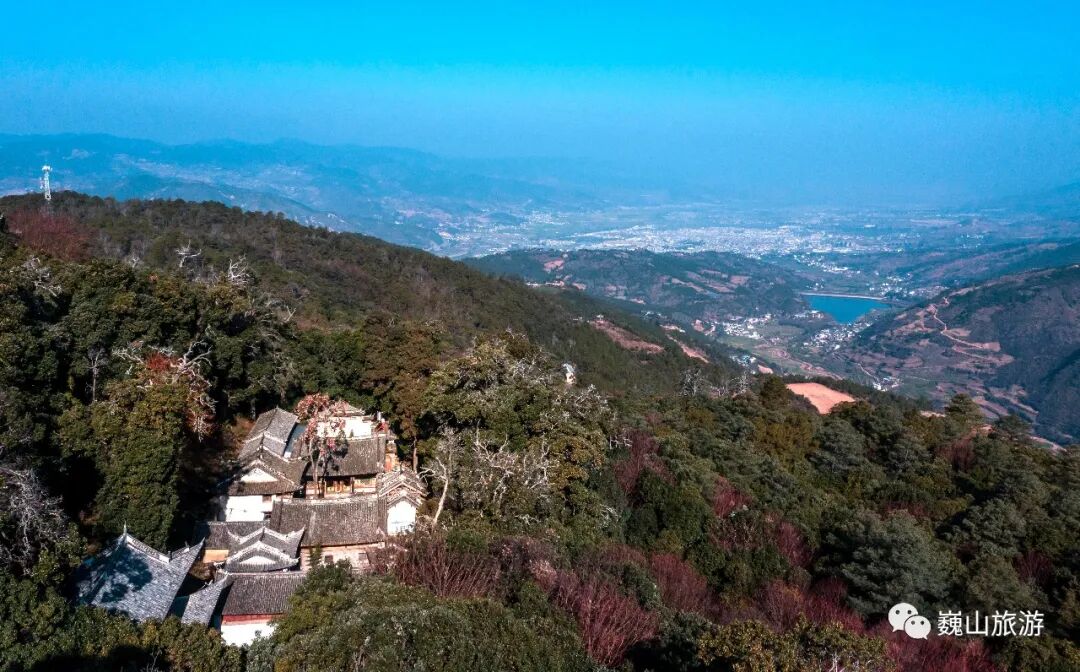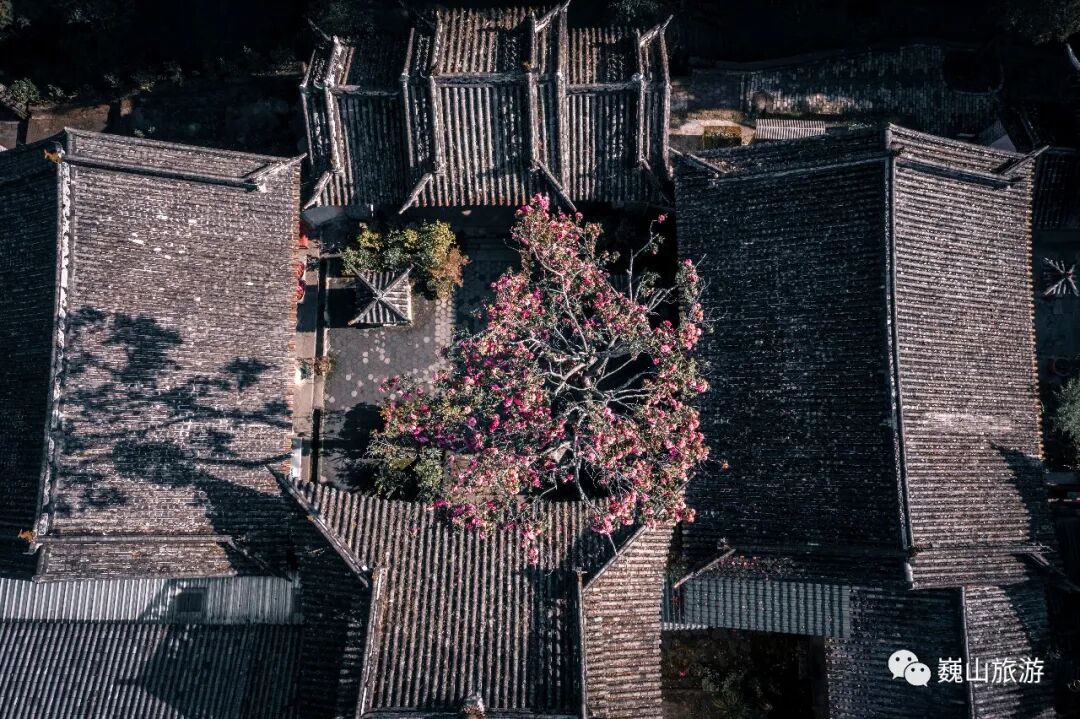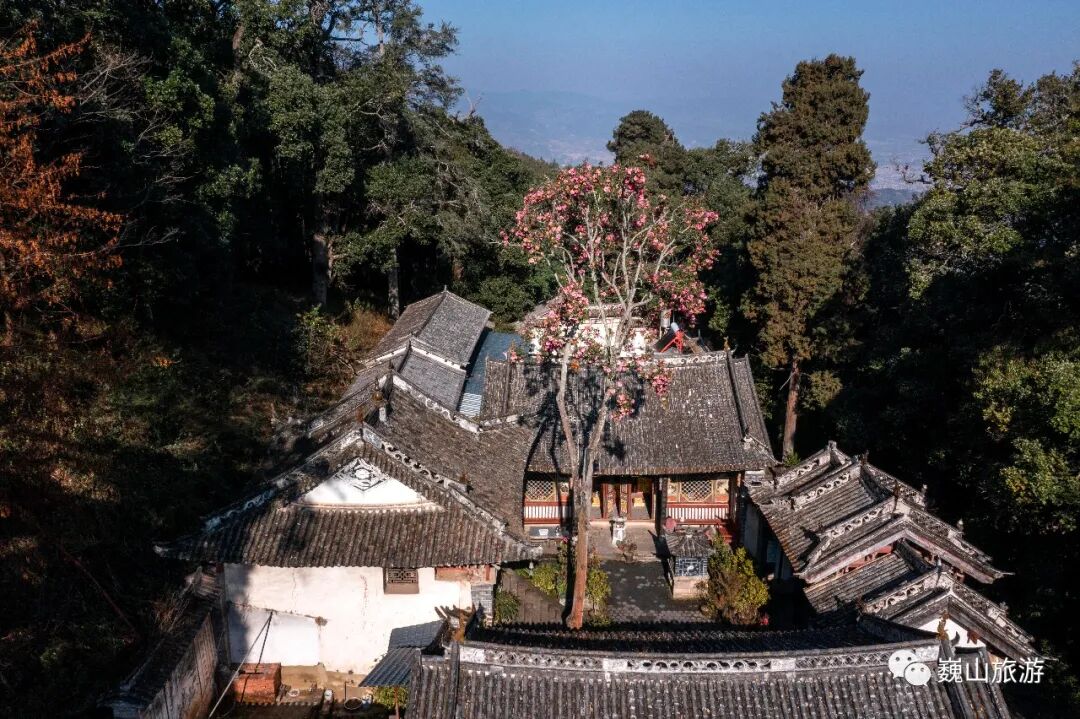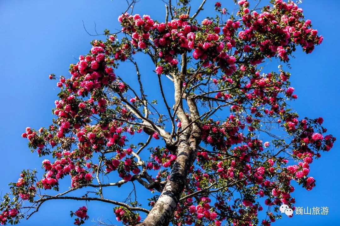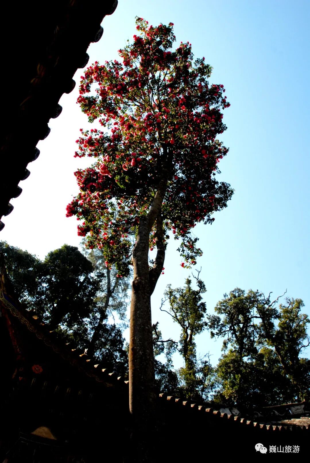 從觀花臺往下看到的茶花王又是另一種風(fēng)采。從這里往下看,古山茶的整棵樹桿都被房屋遮住了,只能看到探出青瓦紅墻的一頂碩大的花冠?;ü谔匠鲂≡?,不管賞花者站在哪個角度,都能看到它搖拽在春風(fēng)中艷若紅云的風(fēng)采。在藍(lán)天白云,紅墻青瓦之間,這團(tuán)紅云好似隨著微風(fēng)正從小院中冉冉升起。這一絕妙的景觀,使我突然明白了巍寶山八大景點之一的“山茶流紅”得名的緣由。