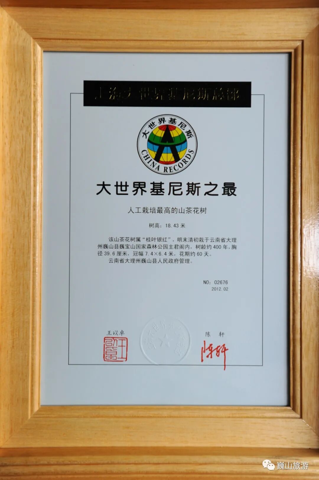 在國家級森林公園的巍寶山靈官殿里,有一棵種植于明代的古山茶。品種為桂葉銀紅,是茶花中的稀世珍品。樹高18.43米,是世界上最高的人工栽培的古山茶樹。2008年2月23日,國際茶花協(xié)會主席格里高力.戴維斯親自到巍寶山目睹了這棵茶花樹,并提筆寫下了相關(guān)的文字,證實了是世界上最高的山茶。2012年,被上海大世界基尼斯紀(jì)錄認(rèn)證,是名副其實的“山茶王”。