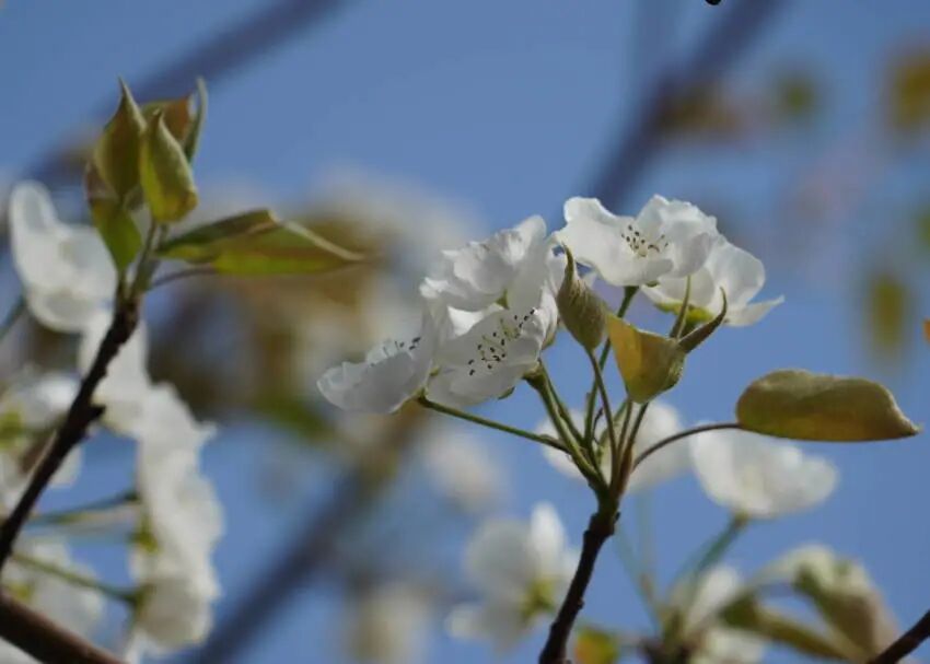走近百畝梨園,放眼望去,猶如陽春白雪,又如一片白色的海洋,雪白的梨花似涌動著的浪濤,在陽光映照和春風(fēng)吹拂下,跳躍著、舞動著。