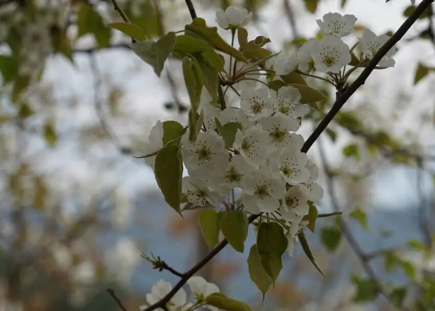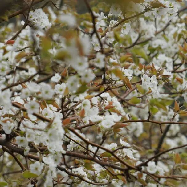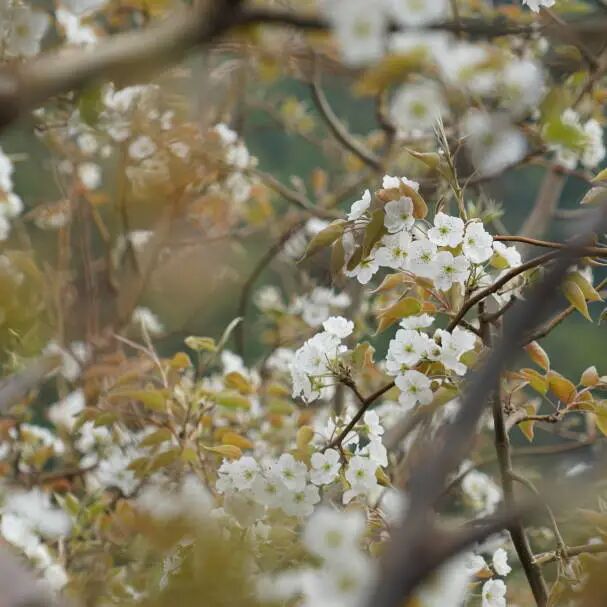 循著梨園小路,進(jìn)入到這如詩如畫繁花似錦的梨園。梨樹虬枝盤曲,枝繁葉茂,枝干如墨勝雪,猶如一幅幅幽靜典雅的水墨畫。