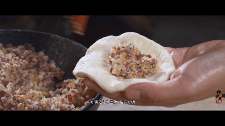 面團上撒上適量的椒鹽,放上豬油、肉沫、小蔥,將它們裹在一起后,需要切上幾刀,這些細節(jié)動作都是在為喜洲粑粑的口味做加分。