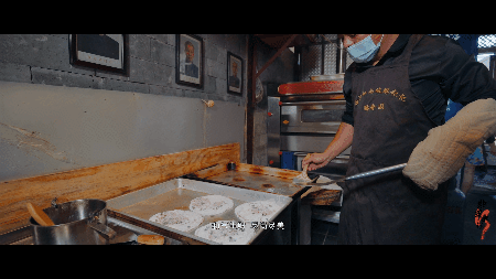 玫瑰、豆沙、紅糖包裹進面團中,搟至約一厘米的厚度,表面刷上一層豬油,即可放入烤箱。烘烤過程中,要多次將喜洲粑粑拿出來翻轉(zhuǎn)。