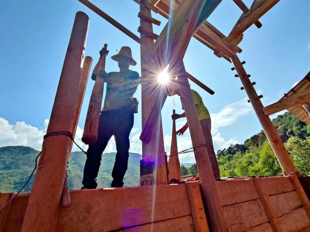 飄梁豎柱扔粑粑,用木榔頭舂土墻……這樣的建房場(chǎng)景,在許多地方已消失了許久,如今卻在新村重現(xiàn)。