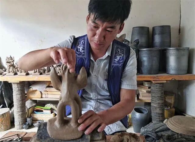 在劍川,除木雕外,土陶也早已深入到人們的日常生活中,土陶技藝也經(jīng)歷了上百年的歷史沉淀。董志明是劍川白族土陶制作技藝州級(jí)代表性技藝傳承人,在開發(fā)黑陶產(chǎn)品時(shí),他想到了當(dāng)?shù)匕鬃寮壹覒魬粑蓓斏隙加械耐哓?,很多外地?lái)的游客都對(duì)瓦貓很好奇,非常喜歡這個(gè)獨(dú)特又可愛(ài)的小神獸。他便把瓦貓作為黑陶旅游產(chǎn)品開發(fā)的一個(gè)重點(diǎn),將瓦貓做成獨(dú)具大理特色的伴手禮品,可以放置在茶桌、書桌上,通過(guò)創(chuàng)意性和應(yīng)用性的設(shè)計(jì),讓瓦貓以全新的方式從屋頂走下來(lái),進(jìn)入人們的日常生活中。