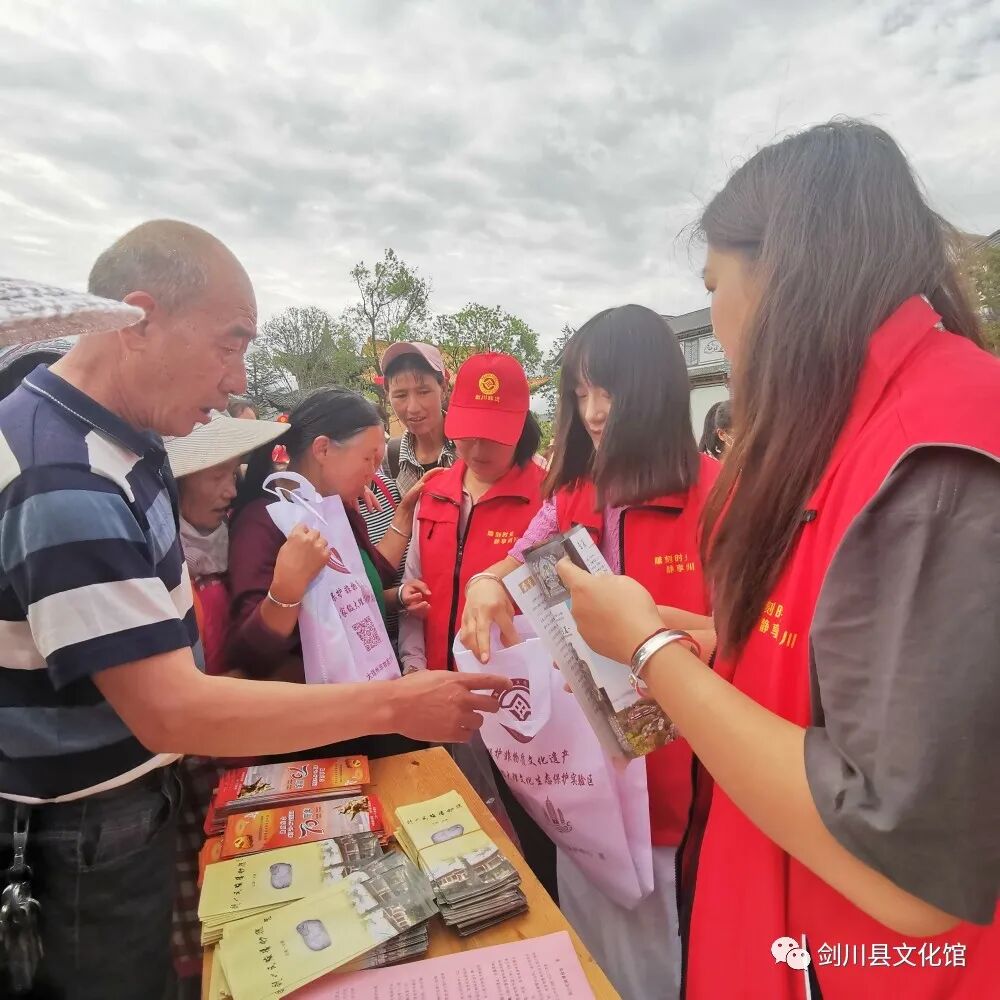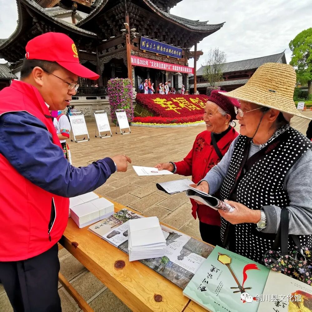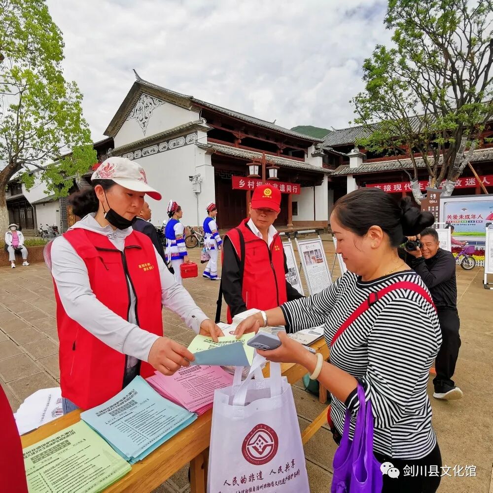 活動(dòng)現(xiàn)場(chǎng),20余名工作人員身穿紅色非遺志愿者服向群眾宣傳發(fā)放《大理州非物質(zhì)文化遺產(chǎn)保護(hù)條例》、大理州非遺保護(hù)傳承大事記宣傳單、環(huán)保袋、遮陽帽等物資,共計(jì)2000多份。以非遺、文物類展板,非遺書籍展示的形式向群眾普及非遺知識(shí),突出宣傳展示劍川非遺保護(hù)工作取得的成果,動(dòng)員社會(huì)力量參與非遺保護(hù)。