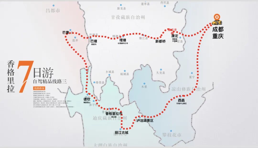 第三條線路從成渝兩地出發(fā),經(jīng)過康定、理塘、巴塘、芒康、德欽、香格里拉市、麗江古城、瀘沽湖景區(qū)、西昌。