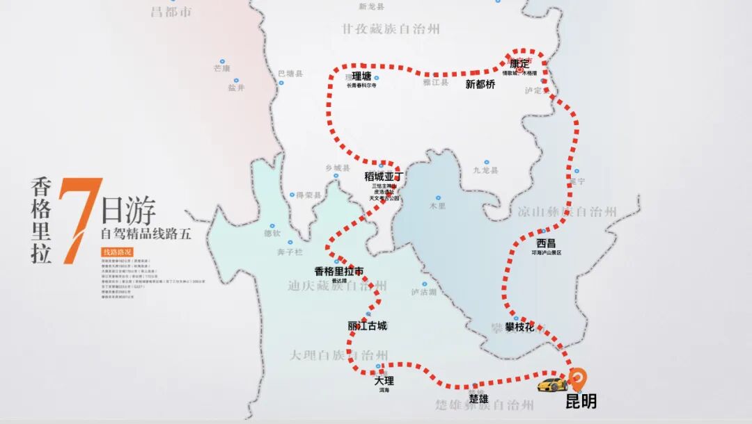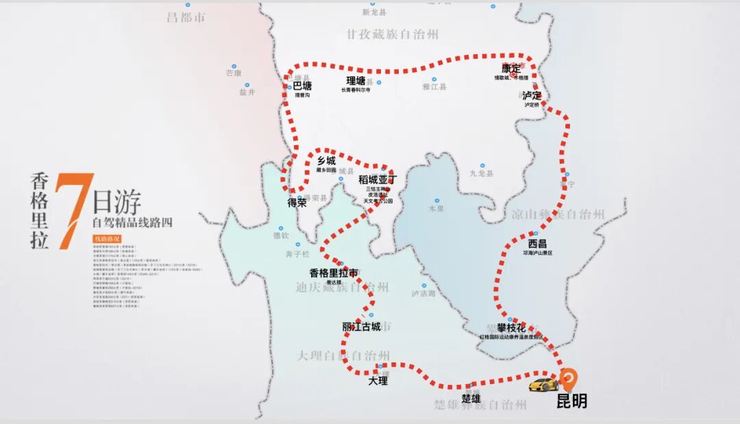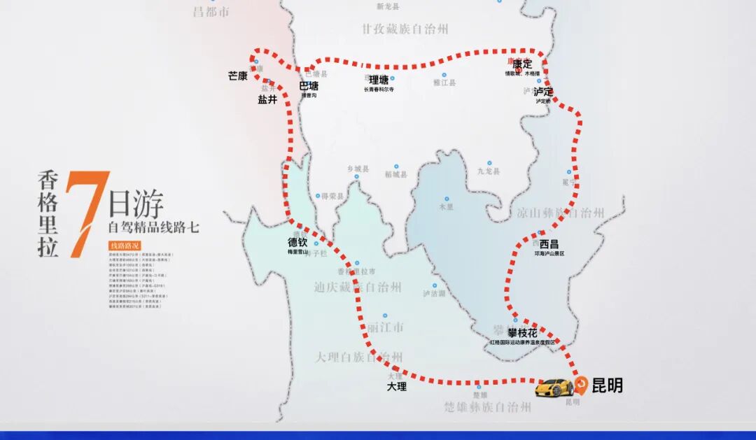 第七條線路從昆明出發(fā),經(jīng)過大理、德欽、鹽井、芒康、巴塘、理塘、康定、瀘定、西昌、攀枝花。