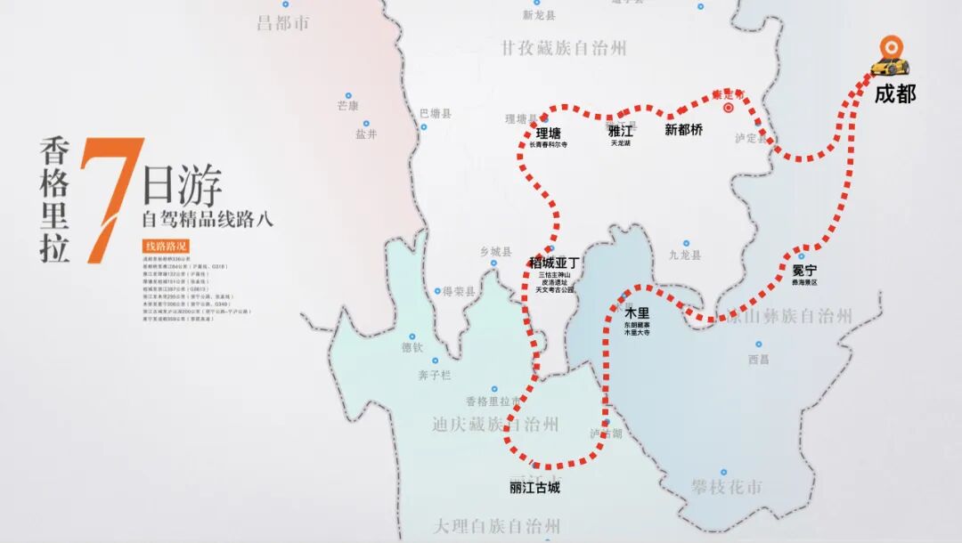 第八條線路從成都出發(fā),經(jīng)過康定、雅江、理塘、稻城、麗江古城、木里、冕寧。