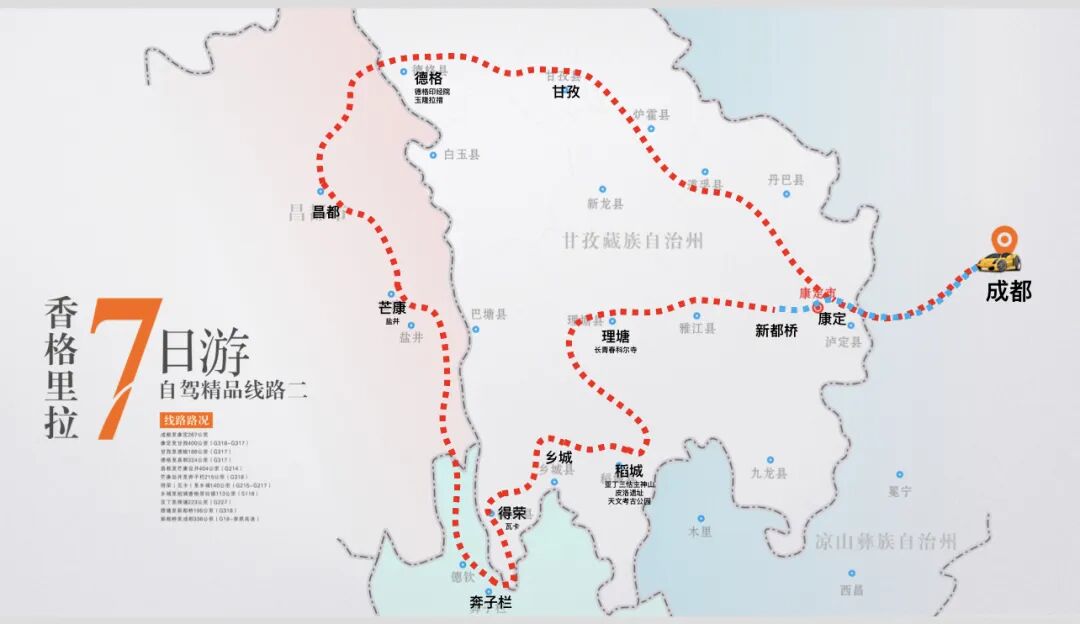 第一條線路從成渝出發(fā),主要經(jīng)過康定市、雅江縣、理塘縣、稻城縣、香格里拉市、麗江古城、瀘沽湖、西昌市。