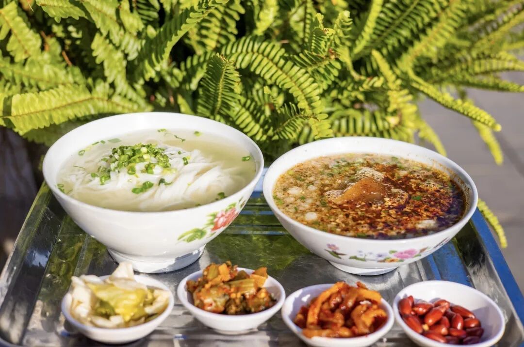 清晨5點(diǎn),面館經(jīng)營(yíng)者朱志秋起鍋熱油,竹筍切丁和肉末一同入鍋,噼里啪啦地澆熱了晨光?!耙桓妗毙寻l(fā)了,扯得根根細(xì)長(zhǎng)。水滾撈出,再澆上炒好的澆頭,就是正宗的巍山味道。