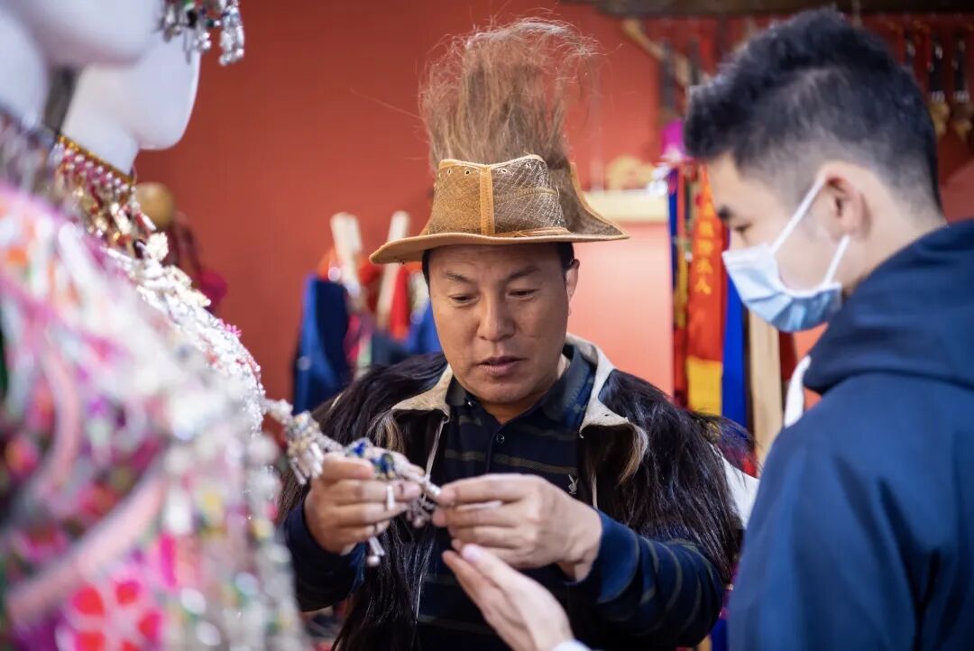 (字汝民(左)正在向游客介紹民族服飾。徐俊 攝)