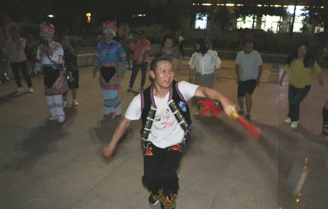 傍晚,漾濞縣蒼山石門關(guān)景區(qū)打歌場(chǎng)上異常熱鬧,州級(jí)彝族大刀舞非遺傳承人吉建富正引領(lǐng)著游客,圍繞著篝火,跳起歡快的彝族打歌,不到一會(huì)兒就吸引來100多名游客。