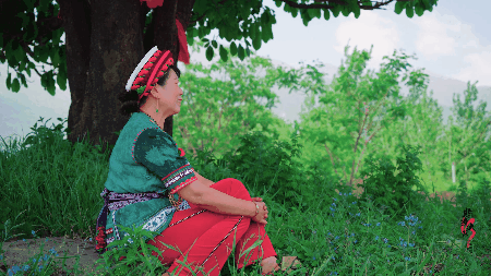 唱白族調(diào)是非常輕松隨意的,唱詞可以根據(jù)情景來創(chuàng)作,肖枝朝的即興能力非常強,目光所及皆是歌詞素材,來幫忙做飯的朋友,被她的贊美之詞夸得是眉開眼笑。而坐在樹蔭底下,她又是獨自等待阿鵬的金花。