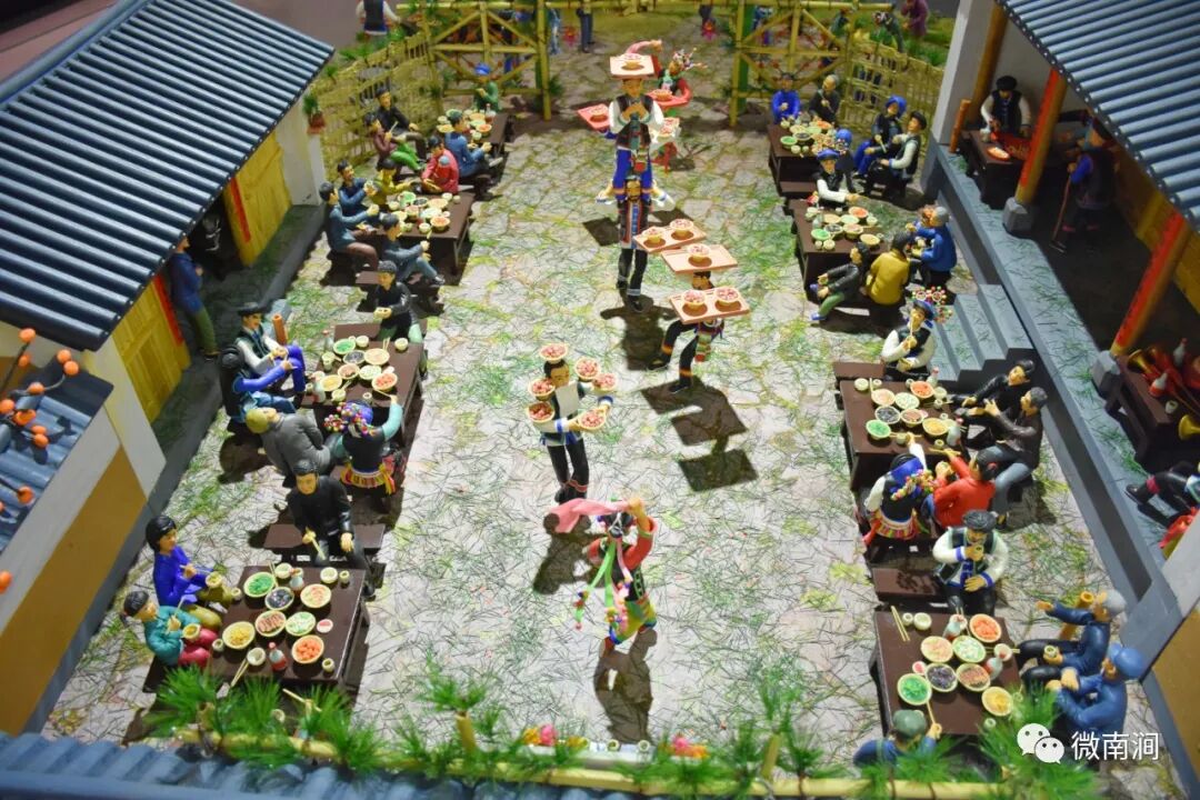 經(jīng)過走廊,透過櫥窗往里看,那安靜佇立的民間傳統(tǒng)跳菜樂器,仿佛不甘寂寞,將凝視它的人帶入了一場熱鬧的“跳菜”盛宴。大鑼開場、嗩吶伴奏,以抬菜人為主、引菜人為輔,頭頂托盤土碗、口銜大勺方桌,合著音樂上菜。這就是南澗跳菜,是南澗民間宴席上菜時為敬重賓朋而舉行的一種具有特定規(guī)程和技藝,融音樂、舞蹈、服飾、飲食于一體的民間禮俗,俗稱“抬菜舞”。它于2008年列入國家級非物質(zhì)文化遺產(chǎn)保護(hù)名錄。