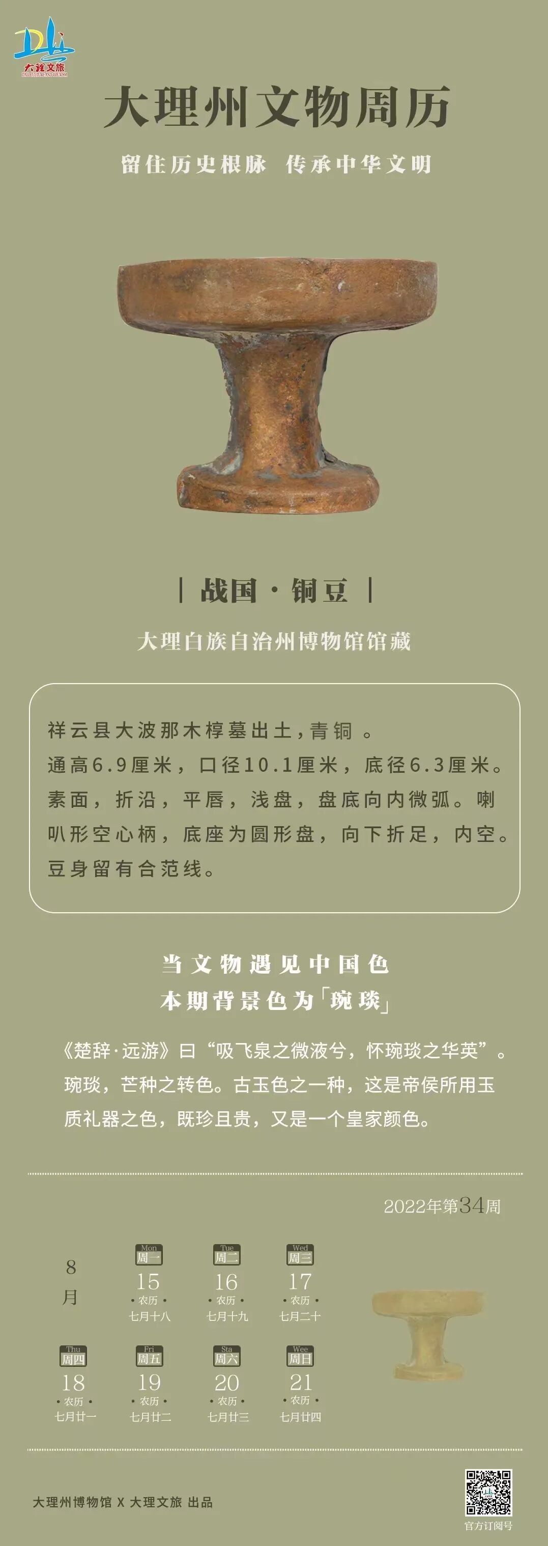 文物周歷,通過文物與周歷、中國傳統(tǒng)色相融合的創(chuàng)意設(shè)計,讓觀眾一周見一樣大理文物,一周見一種中國傳統(tǒng)顏色,在感受時光變化,了解大理文物的同時,看見中國傳統(tǒng)文化之美。