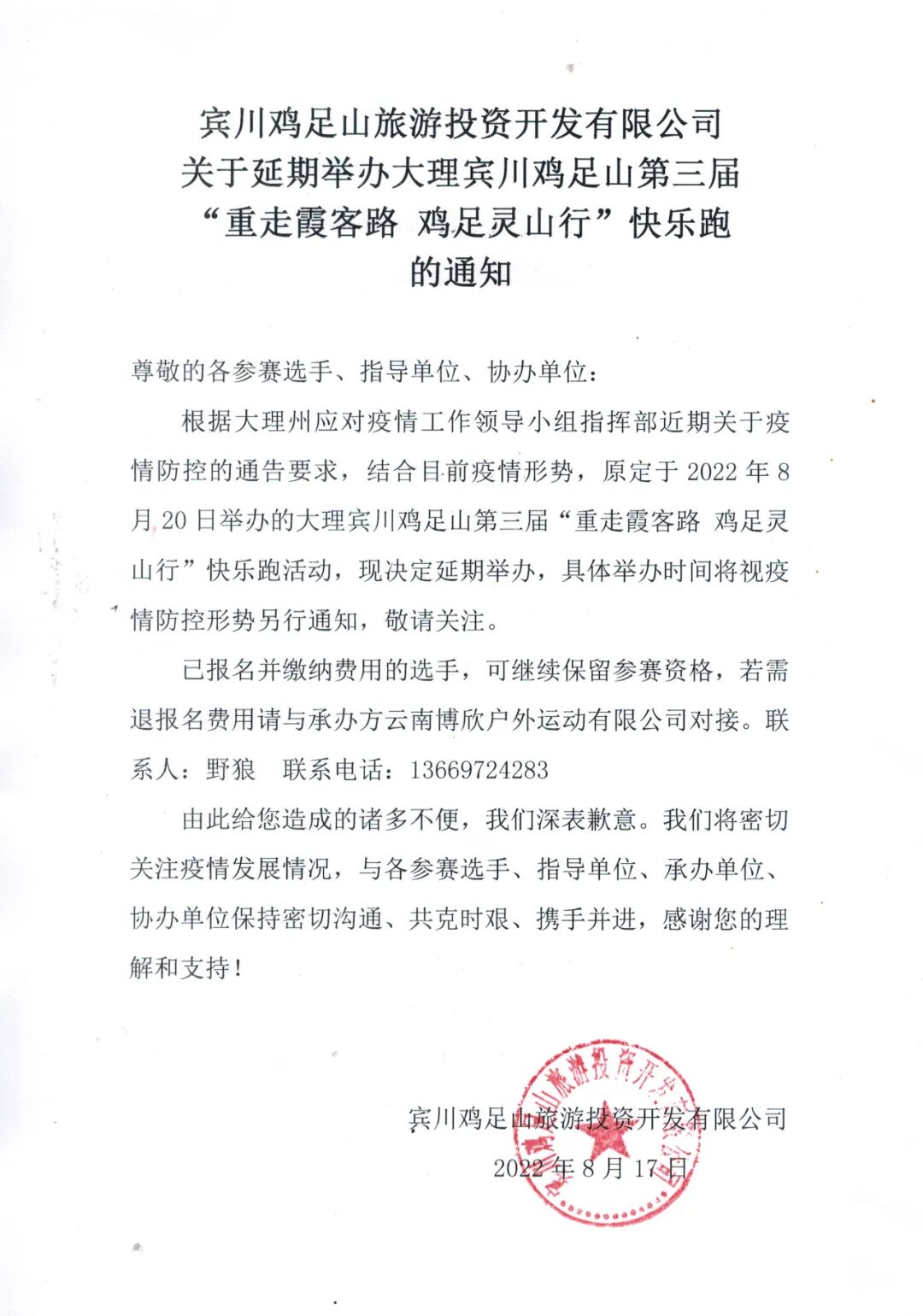 根據(jù)大理州應(yīng)對疫情工作領(lǐng)導(dǎo)小組指揮部近期關(guān)于疫情防控的通告要求,結(jié)合目前疫情形勢,原定于2022年8月20日舉辦的大理賓川雞足山第三屆“重走霞客路 雞足靈山行”快樂跑活動,現(xiàn)決定延期舉辦,具體舉辦時間將視疫情防控形勢另行通知,敬請關(guān)注。