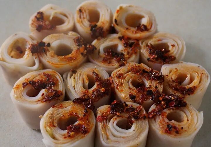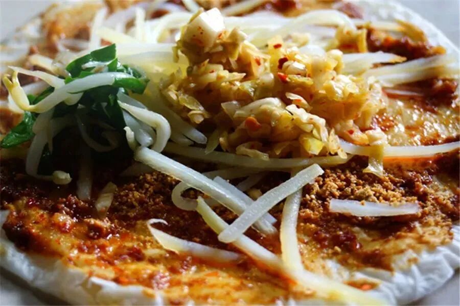 “一攤一抹,一卷一切”,粉皮上,加上新鮮的豆芽和酸溜溜的泡菜,抹上核桃醬,酸辣可口。
