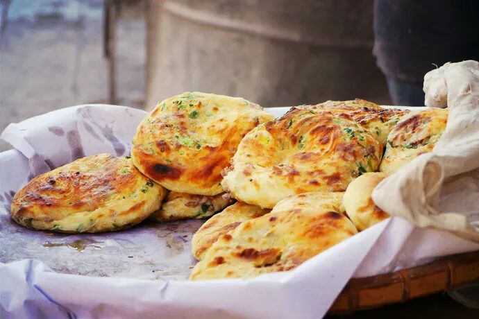 被稱為“東方披薩”,有香甜口玫瑰糖口味和鮮肉蔥花味,外酥里嫩,油而不膩。