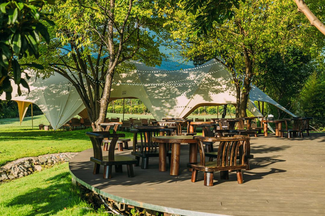 午后,和家人伙伴一起坐在樹屋舞臺下,品嘗美食,舉杯共飲,度過美好的周末時光。