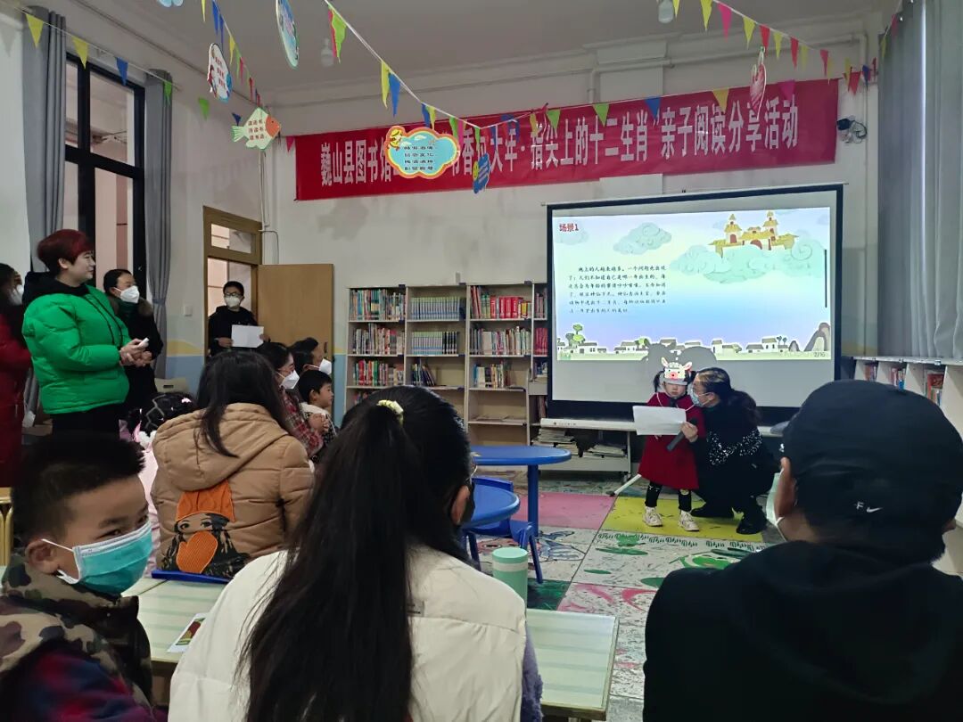 一大早,孩子們?cè)谟H人的陪同下興致勃勃地來(lái)到了圖書(shū)館?;顒?dòng)中,他們一起饒有興趣地欣賞繪本《十二生肖的故事》,15個(gè)親子家庭分別模擬故事里的場(chǎng)景,共同表演十二生肖的由來(lái),讓故事里的各個(gè)場(chǎng)景活靈活現(xiàn)地呈現(xiàn)在大家面前。孩子們和他們的親人分飾角色,協(xié)作表演,把《十二生肖的故事》演繹得惟妙惟肖,妙趣橫生。