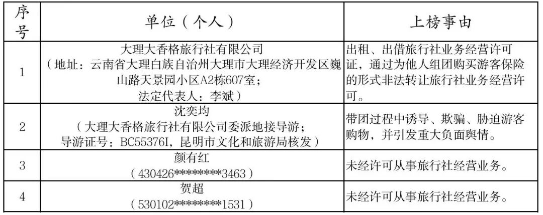 為鞏固好旅游市場(chǎng)秩序整治成果,切實(shí)維護(hù)旅游者合法權(quán)益,引導(dǎo)市場(chǎng)良性健康發(fā)展,大理州旅游市場(chǎng)秩序整治工作領(lǐng)導(dǎo)小組辦公室公布了2023年度第1期大理州文化和旅游“紅黑榜”名單,表彰行業(yè)先進(jìn),曝光不良企業(yè)和個(gè)人,具體名單如下: