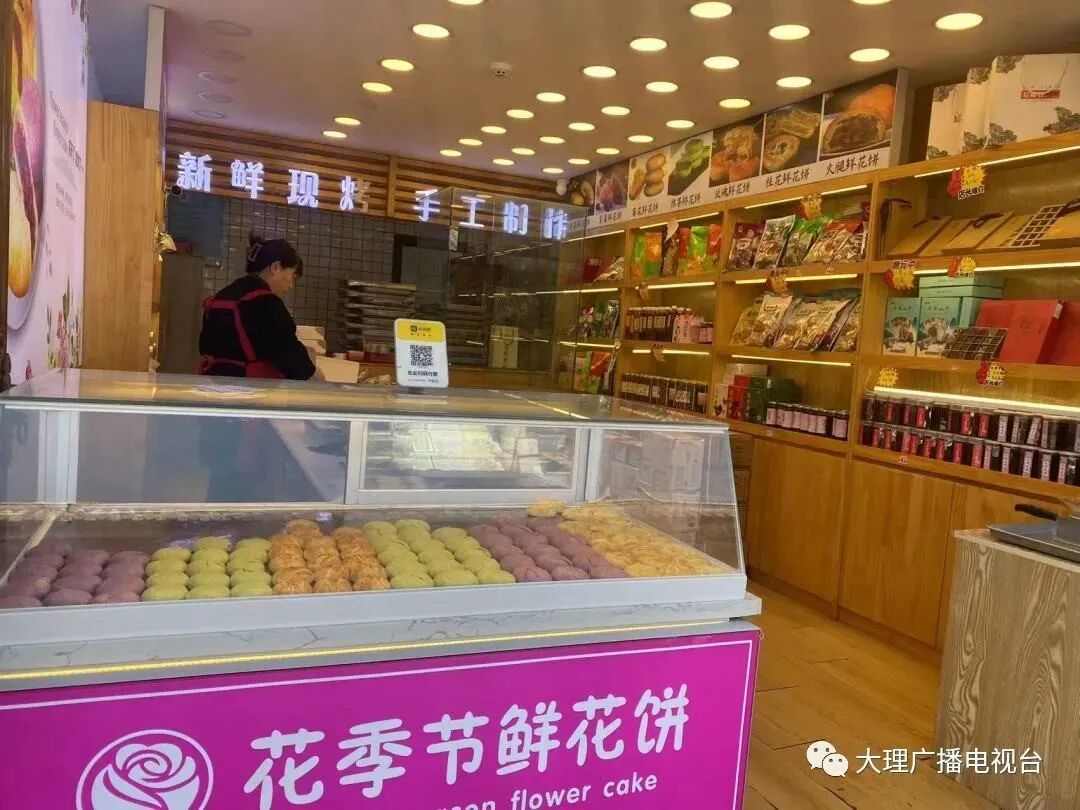 鮮花餅作為大理一大美食特色,深受游客的喜愛,花季節(jié)鮮花餅店在古城已經(jīng)開了五六年,主要經(jīng)營鮮花餅和大理當?shù)靥禺a(chǎn),店員楊阿姨表示能實實在在感受到人多起來了,生意好起來了。