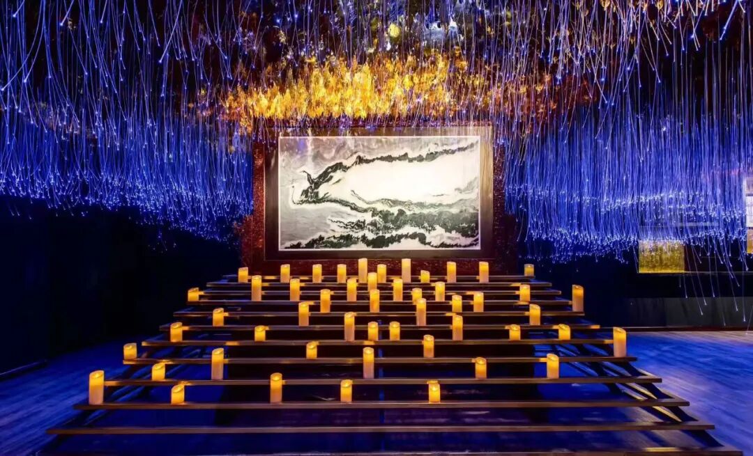 鳳求凰展廳采用宇宙星空般的設(shè)計,光影流動,璀璨奪目,讓人仿佛置身星海。其間的鎮(zhèn)館之寶《鳳求凰》是大理石中難得一見的珍品,天然的石紋在這塊大理石上描繪出兩只振翅高飛的鳳凰,一只翱翔于前,一只追逐在后,仿佛后面的鳳,正在追求前者。