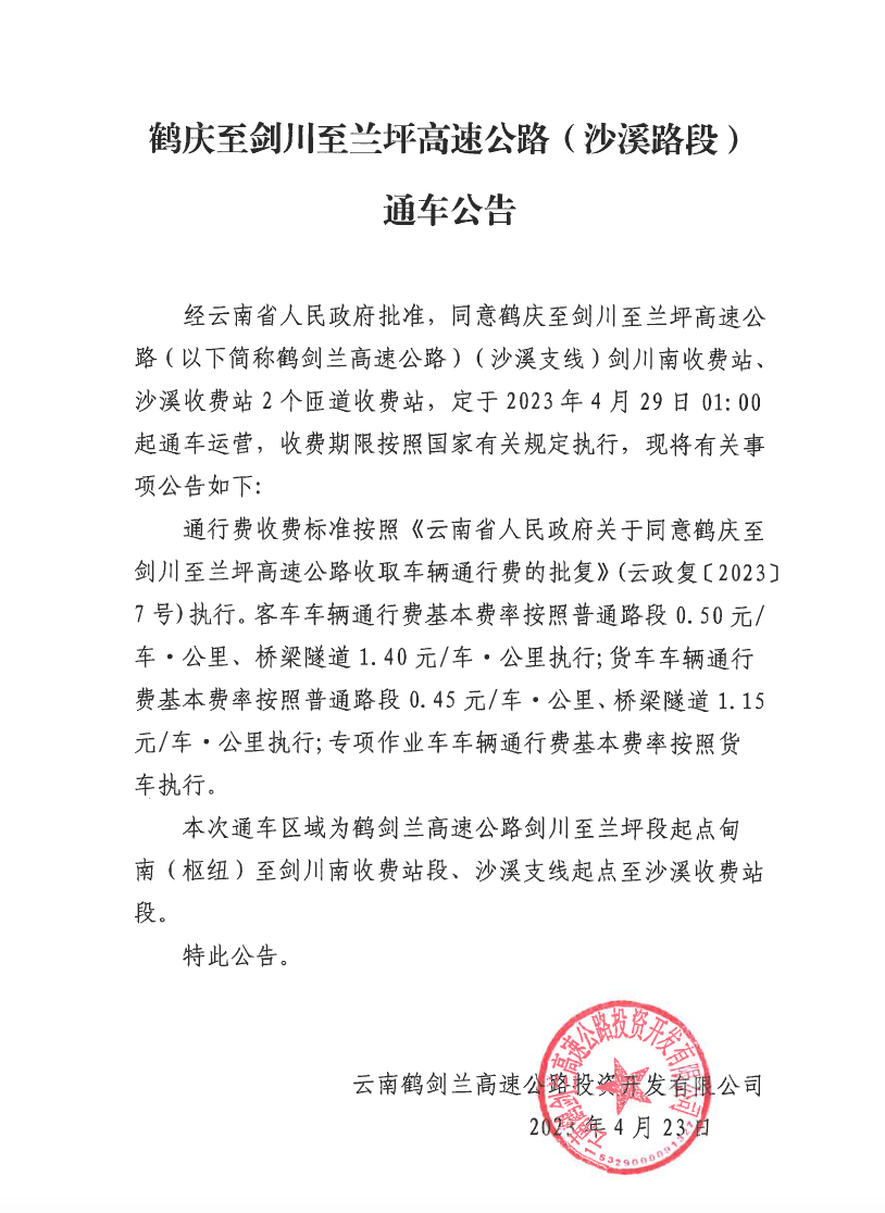 經(jīng)云南省人民政府批準(zhǔn),同意鶴慶至劍川至蘭坪高速公路(以下簡(jiǎn)稱鶴劍蘭高速公路)(沙溪支線)劍川南收費(fèi)站、沙溪收費(fèi)站2個(gè)匝道收費(fèi)站,定于2023年4月29日01:00起通車運(yùn)營,收費(fèi)期限按照國家有關(guān)規(guī)定執(zhí)行,現(xiàn)將有關(guān)事項(xiàng)公告如下:
