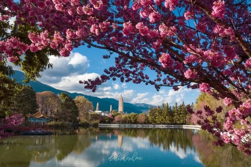 信步景區(qū)中,東瞰洱海四島,西觀蒼山十九峰,南望鳥吊勝景,北眺玉龍奇峰。春有紅花漫天飛舞;夏有雨荷含苞而立;秋有黃葉繾綣旖旎;冬有飛雪日照塔影。朝聞飛鳥啼鳴,暮聽松濤陣陣,悠悠碧池與卓卓古樹相擁。