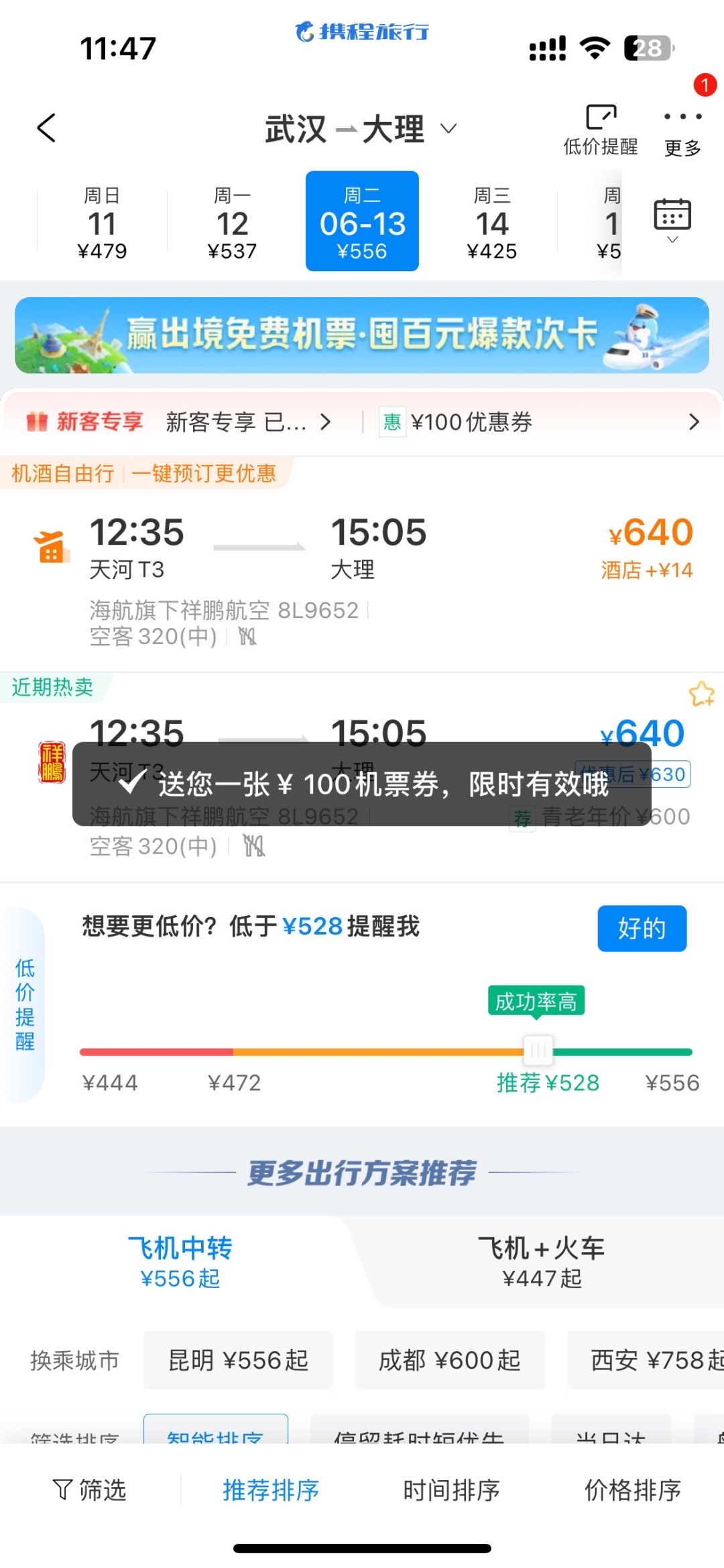 打開攜程旅行APP“機票”頻道,直接預(yù)訂濟南、廈門、合肥、天津、太原、青島、三亞、溫州、石家莊、沈陽、蘭州、南通、泉州、哈爾濱、烏魯木齊、長春、揭陽、常州、西寧、銀川、包頭、呼和浩特、???、煙臺等24個城市始發(fā),經(jīng)昆飛中轉(zhuǎn)至大理的中轉(zhuǎn)航線,即可享受100元的機票直減優(yōu)惠。