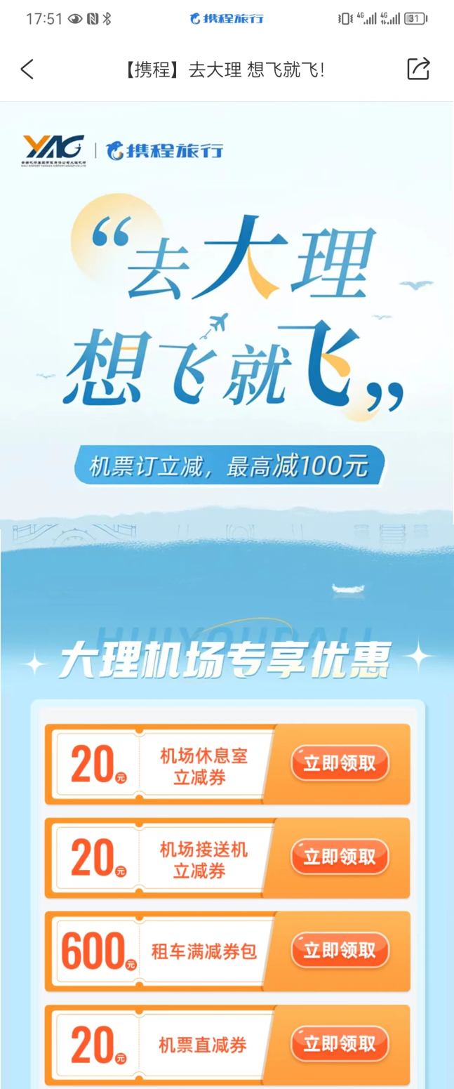 為提升大理進(jìn)出港航線的在線航旅服務(wù),大理機場聯(lián)合攜程旅行網(wǎng)為大理機票直減補貼活動配套發(fā)放機場休息室、機場接送機、租車券包、機票直減券等多品類優(yōu)惠券,用戶可以在活動頁面上直接領(lǐng)取。