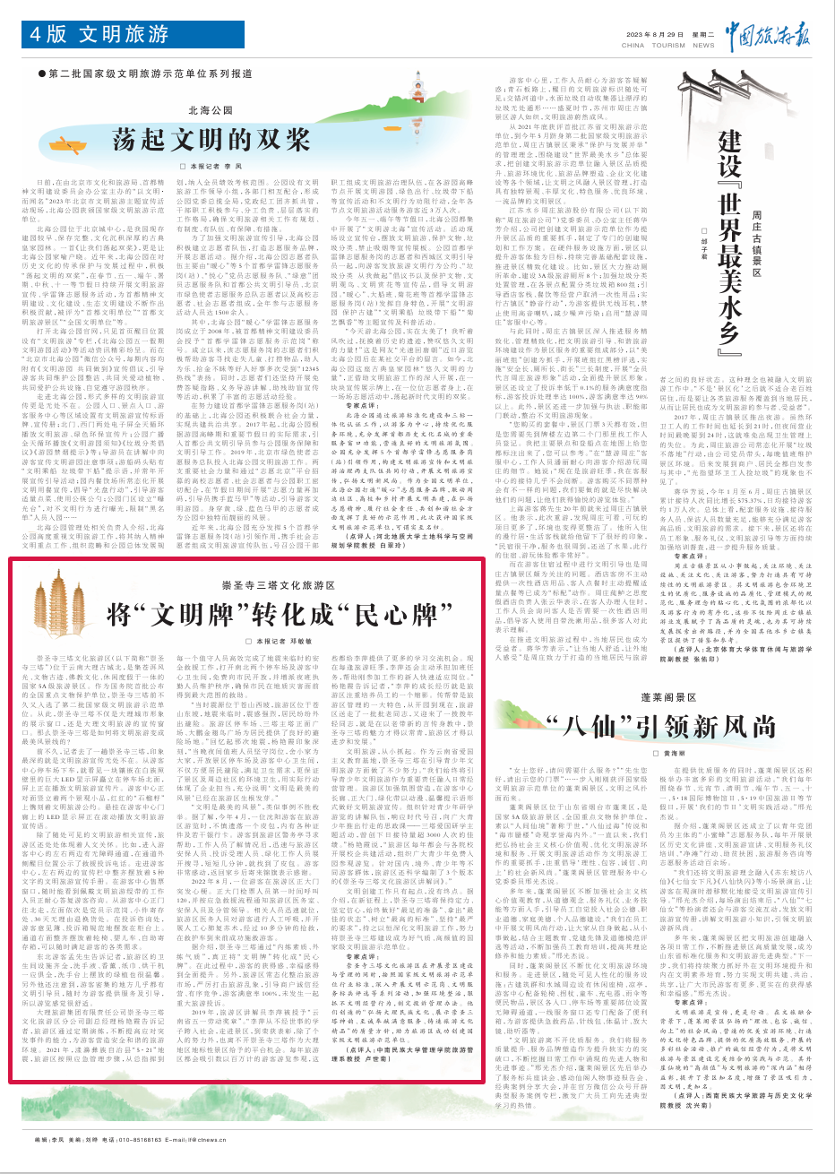 文明旅游,從小抓起。作為云南省愛國主義教育基地,崇圣寺三塔在引導青少年文明旅游方面做了不少努力?!拔覀兪冀K將引導青少年文明旅游作為重要責任融入日常經(jīng)營管理。旅游區(qū)加強氛圍營造,在游客中心長廊、正大門、綠化帶以動漫、溫馨提示語形式做好文明旅游宣傳。組織針對青少年研學游覽的講解隊伍,響應時代號召,向廣大青少年推出行走的思政課——三塔愛國研學主題活動,曾創(chuàng)下日接待量超3000人次的佳績?!睏钇G霞說,“旅游區(qū)每年都會與各院校開展校企共建活動,組織廣大青少年免費入園參觀游覽。針對國內(nèi)、境外、青少年等不同游客群體,旅游區(qū)還科學編制了3個版本的《崇圣寺三塔文化旅游區(qū)講解詞》?!?/p>