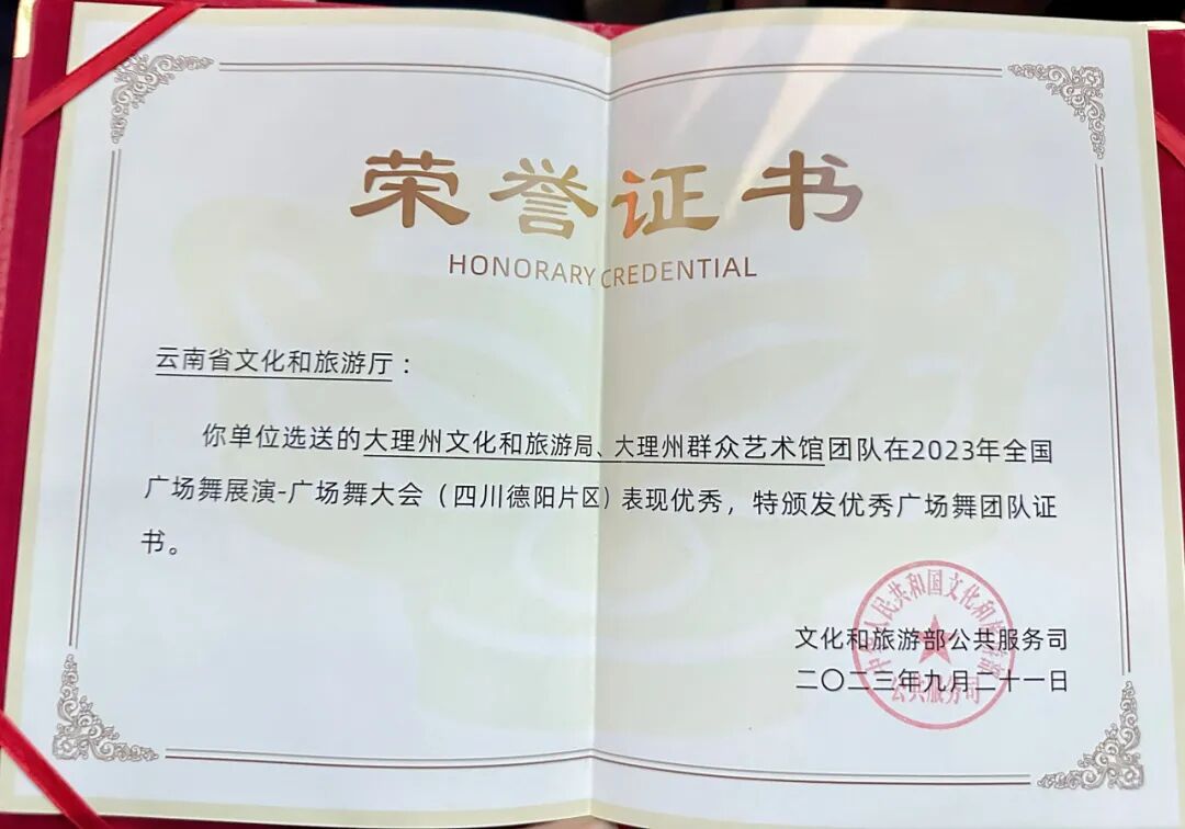 9月21日晚,由文化和旅游部公共服務(wù)司、文化和旅游部全國公共文化發(fā)展中心主辦的“引領(lǐng)新風(fēng)尚 歡躍新時(shí)代”2023年全國廣場(chǎng)舞展演——廣場(chǎng)舞大會(huì)(四川德陽片區(qū))在四川德陽盛大開幕。大理州文化和旅游局、大理州群眾藝術(shù)館團(tuán)隊(duì)喜獲“優(yōu)秀廣場(chǎng)舞團(tuán)隊(duì)”。