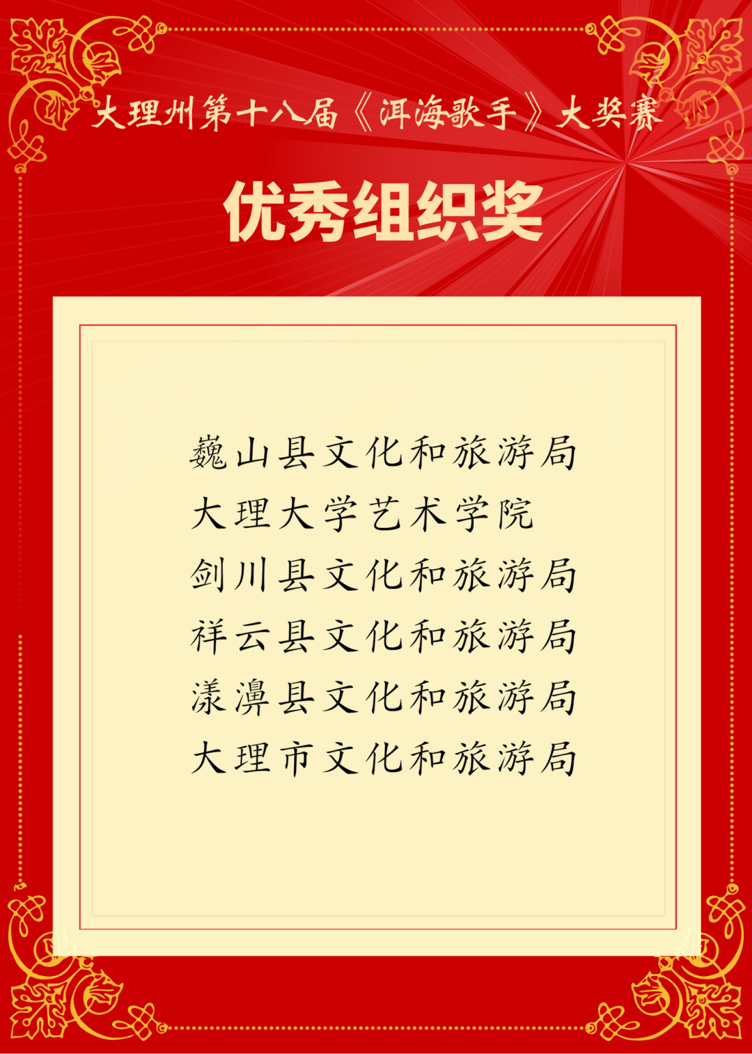 此次大賽由中共大理州委宣傳部、大理州文化和旅游局主辦,大理州群眾藝術(shù)館承辦,大理州12縣(市)文化和旅游局、大理市融媒體中心、大理州音樂家協(xié)會協(xié)辦。