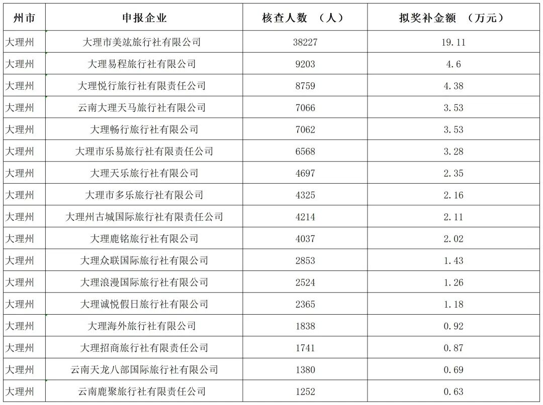 為支持旅行社集團化發(fā)展,進一步調(diào)動我省旅游市場主體引客入滇的積極性和主動性,加快推動旅游市場恢復發(fā)展,貫徹落實《云南省人民政府關(guān)于印發(fā)2023年推動經(jīng)濟穩(wěn)進提質(zhì)政策措施的通知》(云政發(fā)〔2023〕2號),根據(jù)《關(guān)于開展全省旅行社招徠省外游客獎補申報工作的通知》要求,省文化和旅游廳按程序認真組織開展了全省旅行社招徠省外游客獎補的申報、審核和評審工作,形成了《全省旅行社招徠省外游客擬獎補名單》。