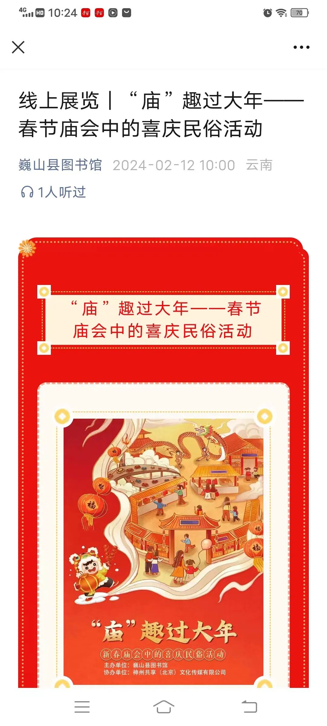 在圖書館微信公眾號舉辦了品讀那些“年”——文學經(jīng)典里的中國年、“廟”趣過大年——春節(jié)廟會中的喜慶民俗活動等線上展覽。讓觀展讀者通過近現(xiàn)代大師們筆下生動的文字,更好地了解和傳承中國年俗文化,同時在品味廟會濃濃年味的過程中了解春節(jié)廟會及廟會民俗文化的喜慶內(nèi)涵,感受中華傳統(tǒng)民俗的魅力。