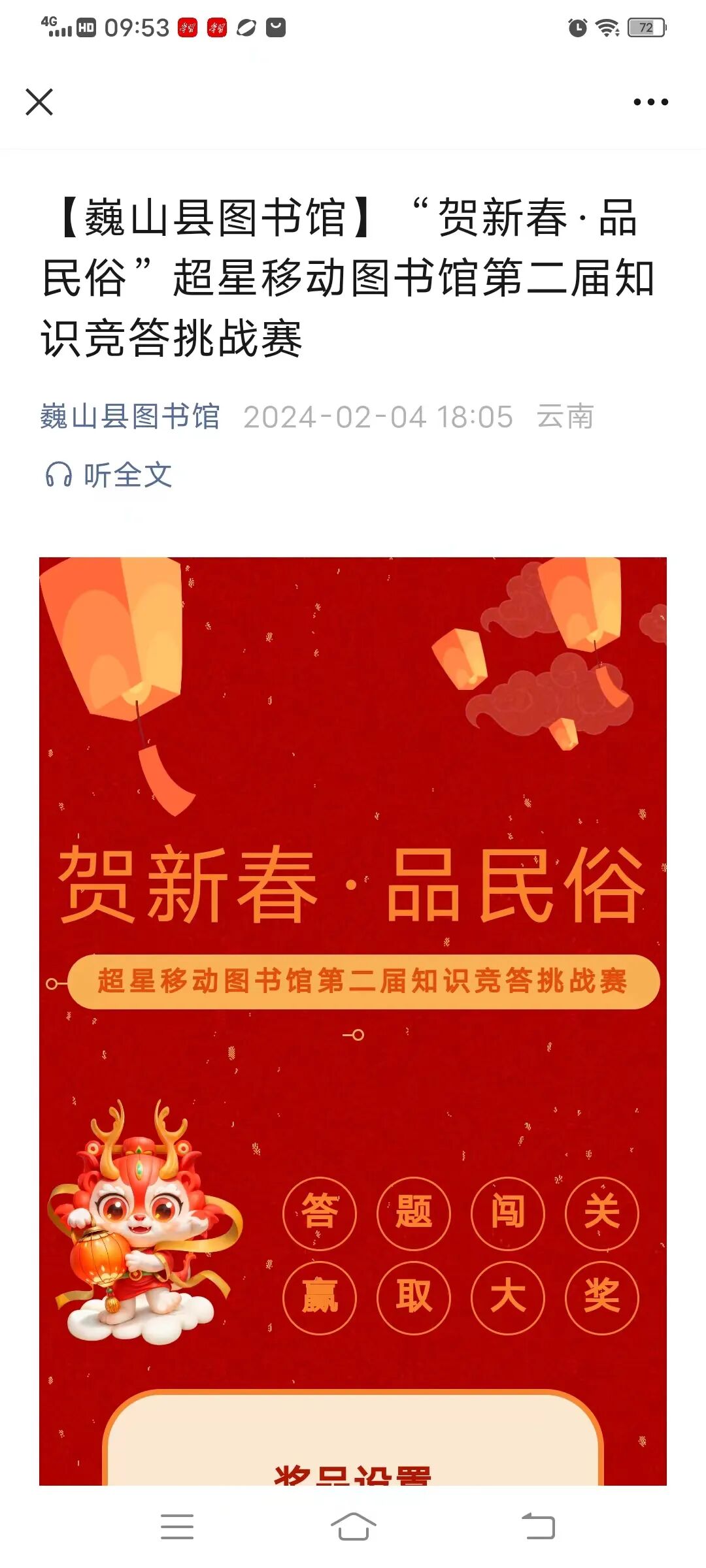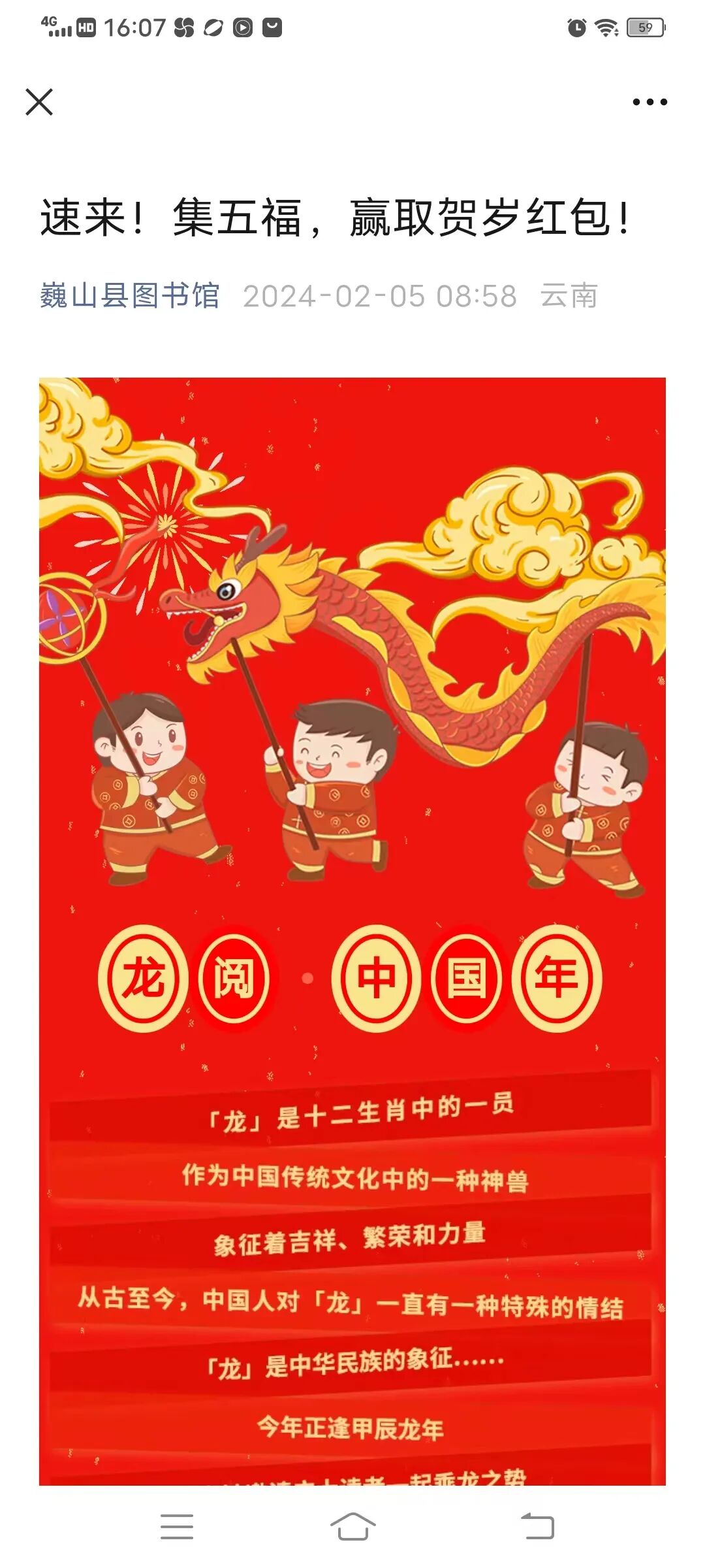 “龍‘閱’中國年”新春線上集?;顒?。2月5日—2月17日,在巍山縣圖書館微信公眾號舉辦“龍‘閱’中國年”新春線上集?;顒樱瑓⒓踊顒幼x者只要掃碼闖關(guān)集福即可抽獎贏好禮。此次活動共有111人參加。