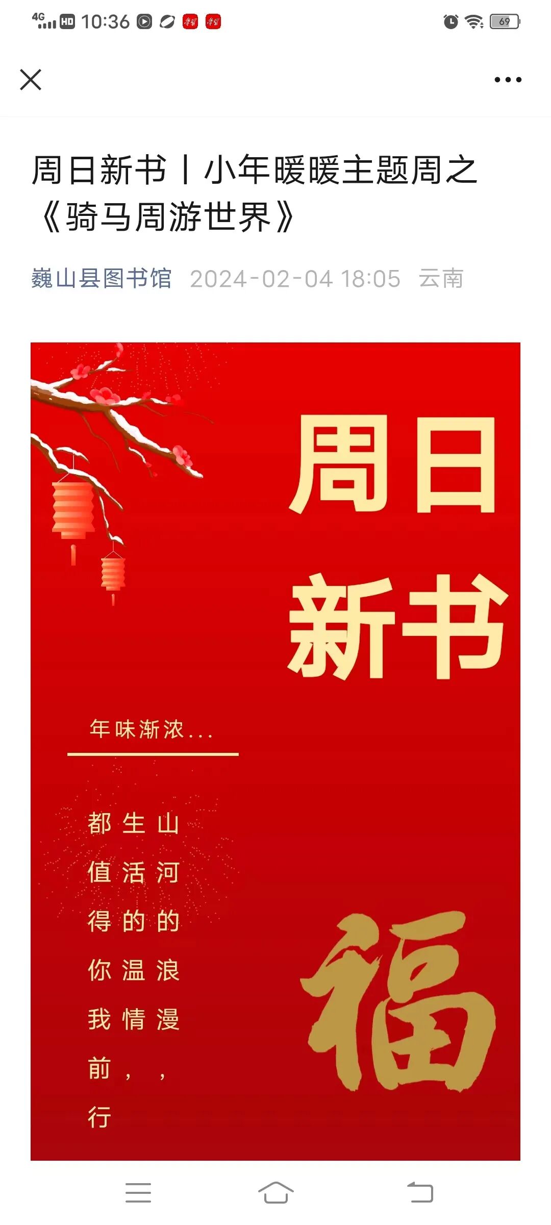通過圖書館微信公眾號向讀者推薦了周日新書—小年暖暖主題周之《騎馬周游世界》《珍珠鳥》《威震敵膽的抗聯(lián)將軍楊靖宇》等經(jīng)典書籍,每天推出一本小人書,讓大家在喜慶的節(jié)日里與好書邂逅,感受閱讀的快樂,不斷豐富精神文化生活。