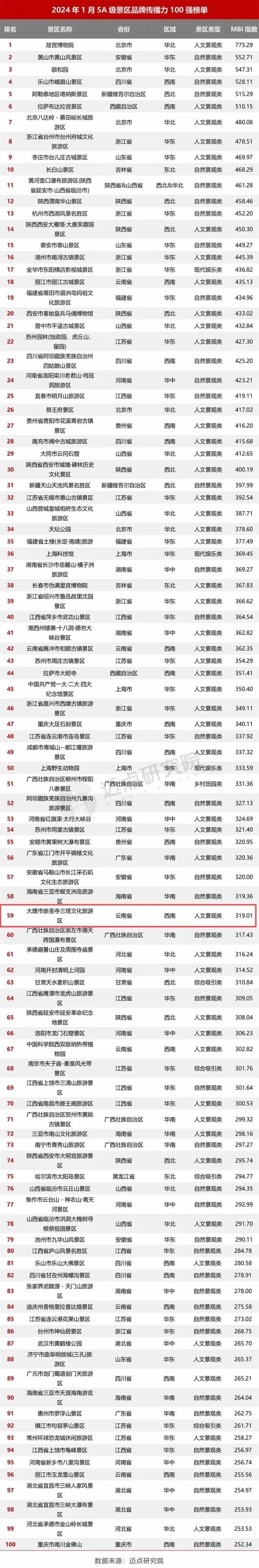 “2024年1月5A級景區(qū)品牌傳播力100強榜單”數(shù)據(jù)來源于邁點品牌指數(shù)MBI,根據(jù)1月邁點品牌指數(shù)MBI的339家景區(qū)數(shù)據(jù)匯總統(tǒng)計而成,主要從搜索指數(shù)、點評指數(shù)、運營指數(shù)、媒體指數(shù)4個維度分析品牌在互聯(lián)網(wǎng)和移動互聯(lián)網(wǎng)的影響力。