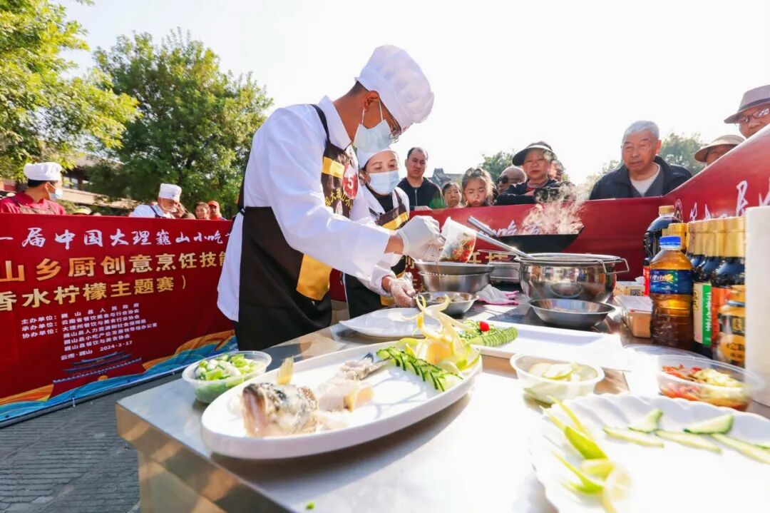 20余位當?shù)刂鲝N及其團隊同臺競技,在規(guī)定時間內(nèi)現(xiàn)場制作兩道菜品,一道為指定輔料菜,使用巍山香水檸檬為輔料,菜品原材料及烹飪方式不限,另一道為巍山傳統(tǒng)菜。