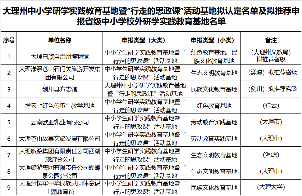 1.?大理州中小學研學實踐教育基地暨“行走的思政課”活動基地擬認定名單及擬推薦申報省級中小學校外研學實踐教育基地名單