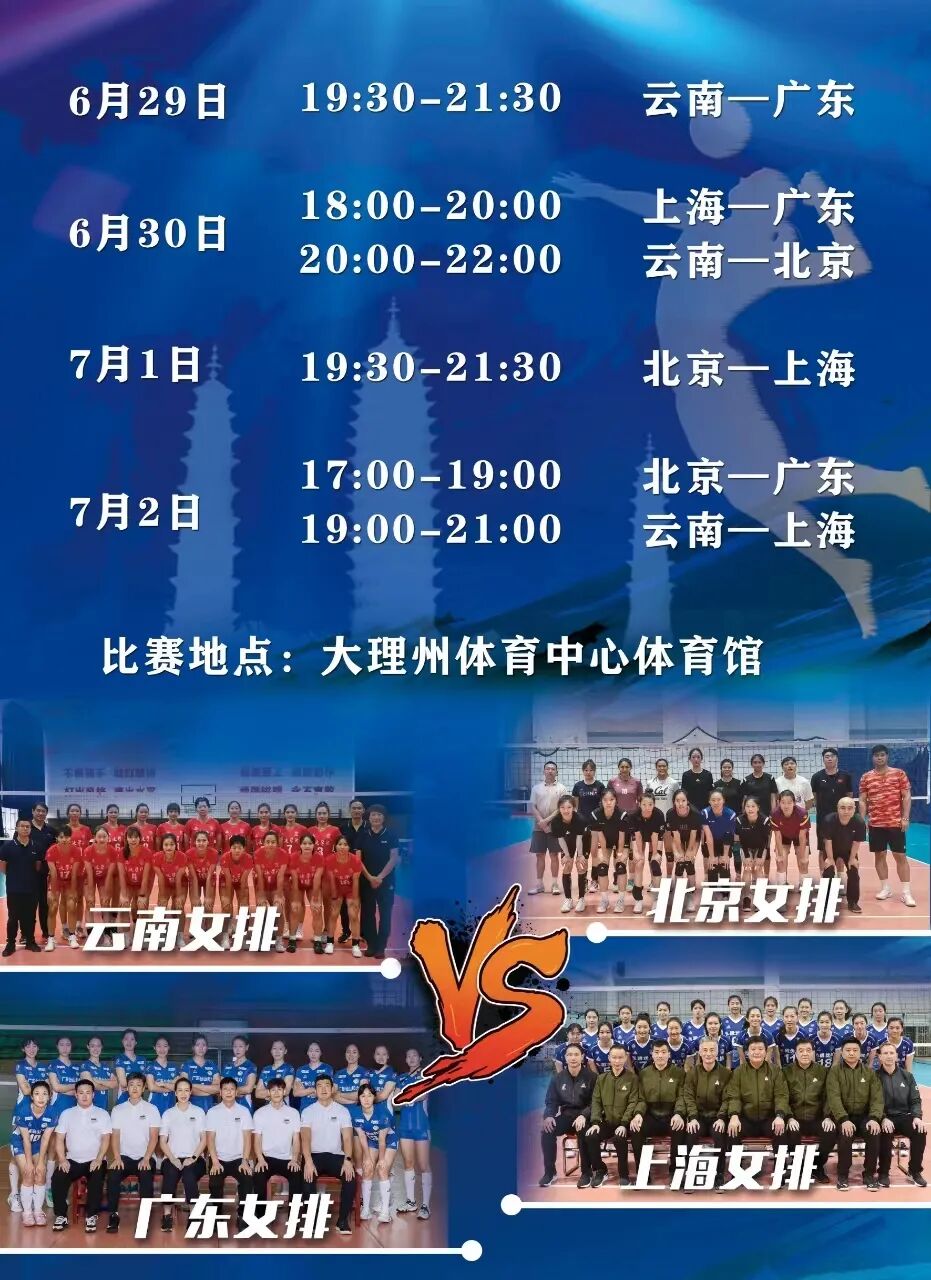為進(jìn)一步增進(jìn)全國(guó)女子排球運(yùn)動(dòng)員之間的友誼,提升排球運(yùn)動(dòng)競(jìng)技水平,助力大理“體育+”全域發(fā)展,2024年云南女排邀請(qǐng)賽將于大理州體育中心開賽!比賽時(shí)間為2024年6月27日至7月3日。