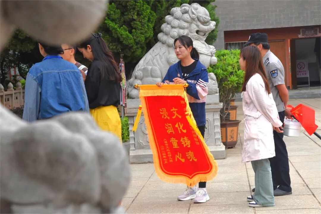 大理市艾比島幼兒園的老師來到游客中心,將一面寫著“文化鑄魂,浸潤童心”的錦旗送到工作人員和志愿者手中,感謝他們一直以來的傾情講解和熱心關(guān)懷。