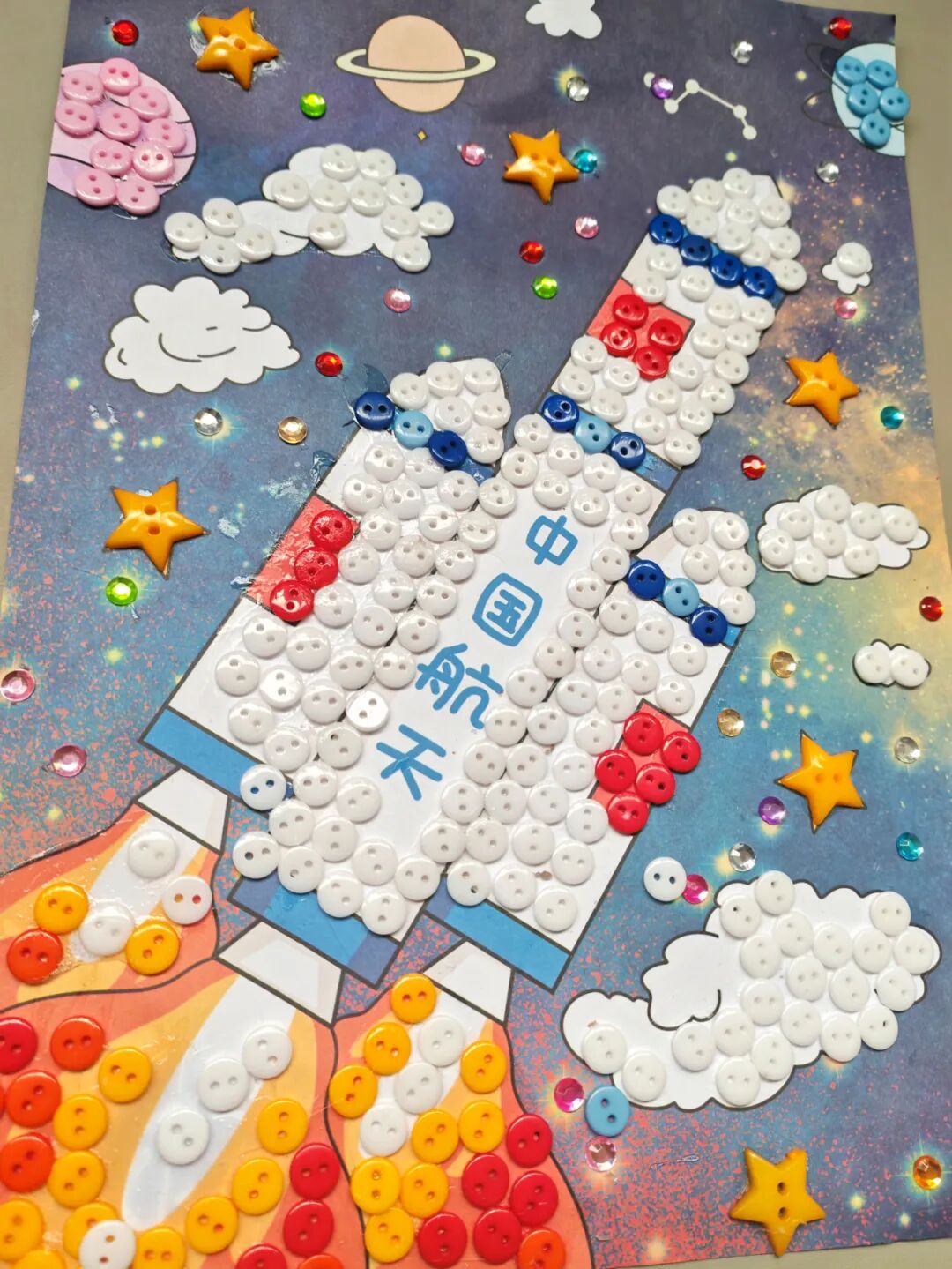 參觀結束后,志愿者帶著小朋友們來到社教活動室,通過對專題展覽的學習,積極和小朋友們交流關于王希季院士和航天的知識。伴隨著小朋友們踴躍的回答聲,開啟了別開生面的手工之旅——制作航天元素的紐扣畫。