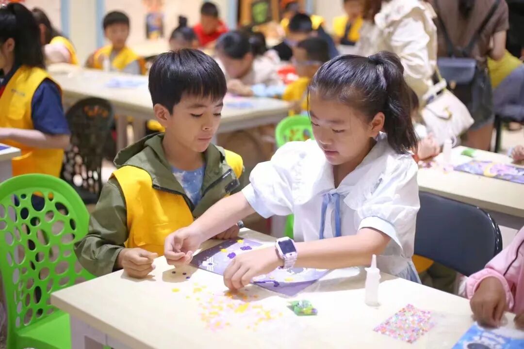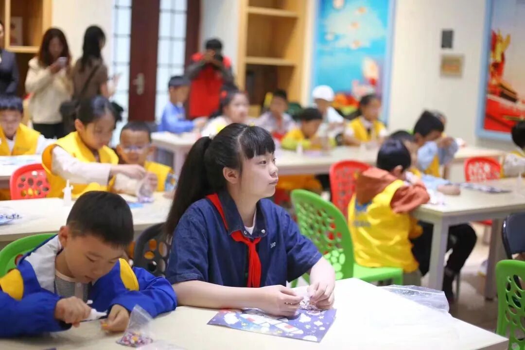 活動中小朋友們發(fā)揮著自己的想象力和創(chuàng)造力,用小小的紐扣拼湊出心中的星辰大海,他們全神貫注,努力讓自己的作品更加完美。隨后,工作人員組織親子家庭進行了航天相關的文藝匯報演出。