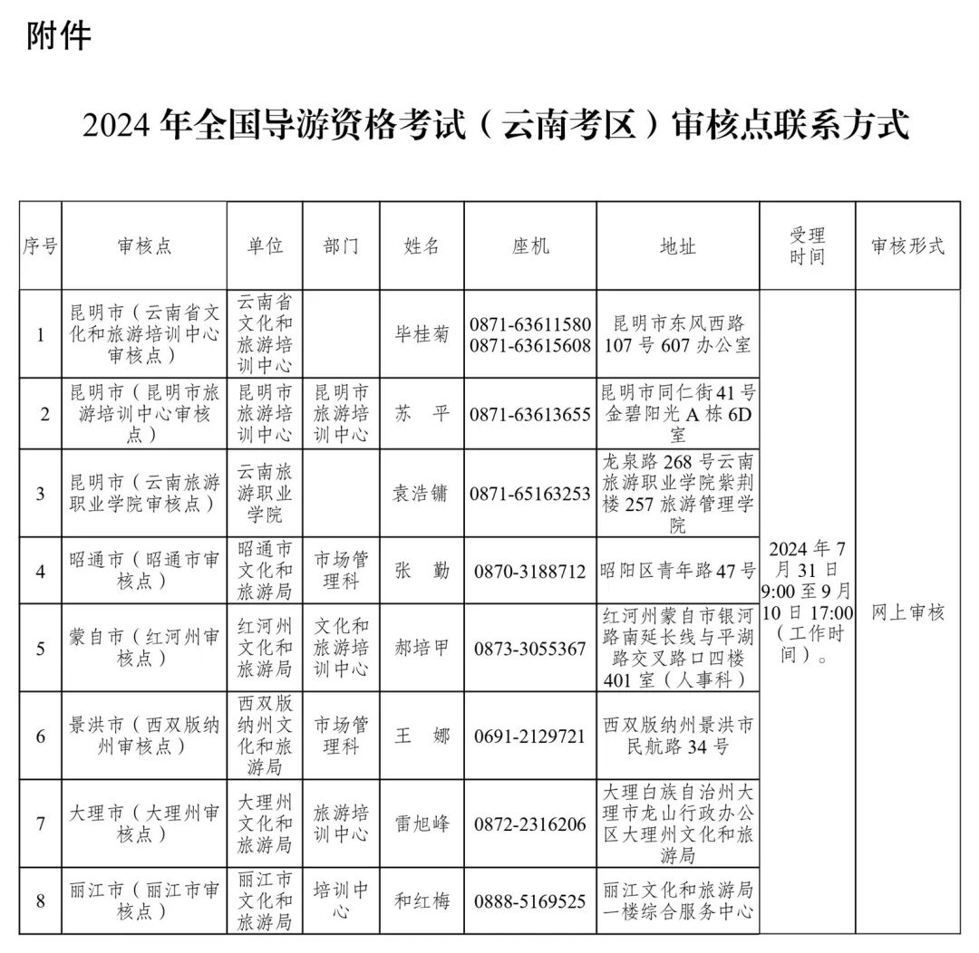 附件:2024年全國(guó)導(dǎo)游資格考試(云南考區(qū))審核點(diǎn)聯(lián)系方式